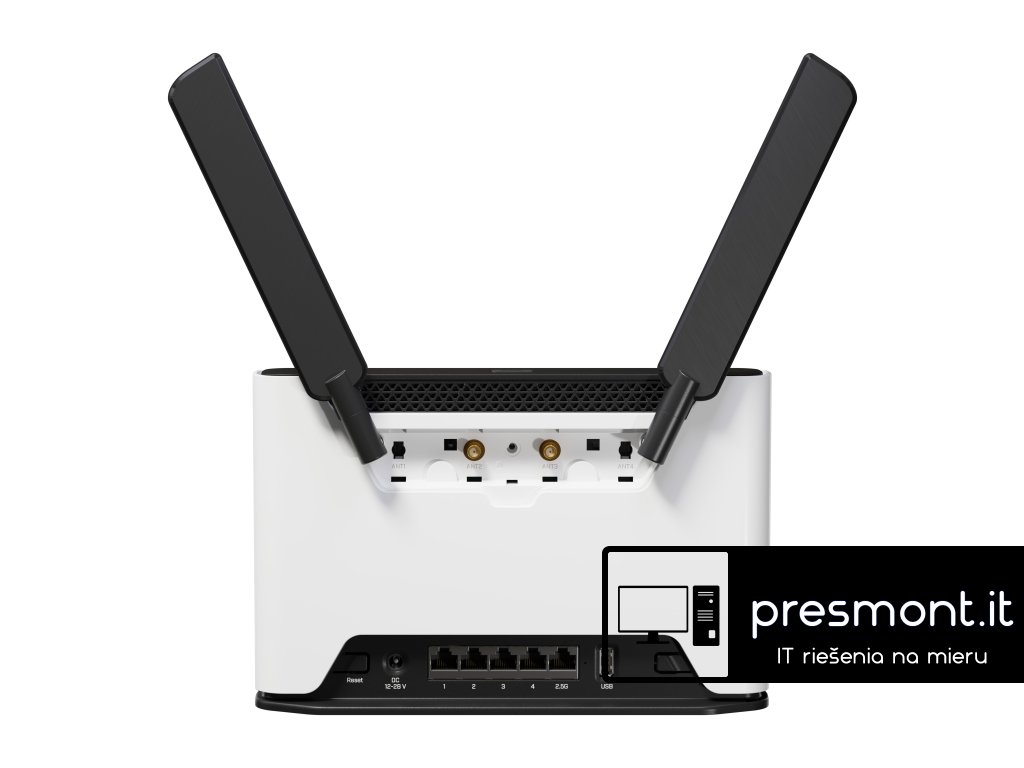 MikroTik S53UG+5HaxD2HaxD-TC&FG621-EA, Chateau LTE6 ax Chateau LTE6 ax je vysokorychlostní dvoupásmový router, který se přizpůsobí vašim potřebám. Je vybaven výkonným čtyřjádrovým procesorem ARM, rychlým, spolehlivým a citlivým modemem CAT6 LTE pro vynikající mobilní připojení, Wi-Fi 6 standardu 802.11ax a nejpokročilejším síťovým softwarem na trhu - RouterOS. Technická specifikace: Architektura ARM *64bit CPU *IPQ-6010 Počet jader CPU *4 Nominální frekvence CPU *auto MHz Model spínacího čipu *IPQ-6010 Licence RouterOS *4 Operační systém *RouterOS v7 Velikost RAM *1 GB Velikost úložiště *128 MB Typ úložiště *NAND MTBF *Přibližně 200 000 hodin při 25 °C Testovaná okolní teplota *-40°C až 70°C Hardwarová akcelerace IPsec *Ano Bezdrátové specifikace: Bezdrátové 2,4 GHz Maximální přenosová rychlost *574 Mbit/s Bezdrátový 2,4 GHz počet řetězců *2 Bezdrátové 2,4 GHz standardy *802.11b/g/n/ax Zisk antény dBi pro 2,4 GHz *2 Bezdrátový čip 2,4 GHz model *QCN-5022 Bezdrátové2,4 GHz generace *Wi-Fi 6 Bezdrátové 5 GHz Maximální přenosová rychlost *1200 Mbit/s Bezdrátový 5 GHz počet řetězců *2 Bezdrátové 5 GHz standardy *802.11a/n/ac/ax Zisk antény dBi pro 5 GHz *4 Bezdrátový 5 GHz čip model *QCN-5052 Bezdrátové 5 GHz generace *Wi-Fi 6 Rychlost WiFi AX1800 Mobilní specifikace: 3G kategorie *R8 (42,2 Mbps downlink, 11,2 Mbps uplink) Pásma 3G *1 (2100 MHz) / 3 (1800 MHz) / 5 (850 MHz) / 8 (900 MHz) LTE kategorie *6 (300 Mbit/s downlink, 50 Mbit/s uplink) MIMO DL *2x2 MIMO UL *1x1 Pásma LTE FDD *1 (2100 MHz) / 3 (1800 MHz) / 5 (850 MHz) / 7 (2600 MHz) / 8 (900 MHz) / 20 (800 MHz) / 28 (700 MHz) Pásma LTE TDD *38 (2600 MHz) / 40 (2300 MHz) / 41 (2500 MHz) TAC *86335904Dodatočné parametre