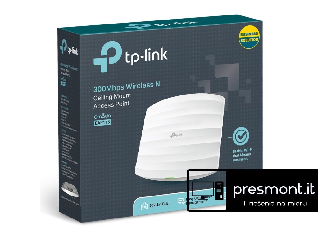 300Mbps Wireless N Ceiling Mount Access Point: EAP115 300Mbps Wireless N Ceiling Mount Access Point, Qualcomm, 300Mbps at 2.4GHz, 802.11b/g/n, 1 10/100Mbps LAN, 802.3af PoE Supported, Centralized Management, Load Balance, Rate Limit, Captive Portal, Cluster Mode, 2 Internal Antennas, Ceiling/Wall Mount Krátké představení Omada SDN: https://www.youtube.com/watch?v=Veb8-o8EE6U PŘEHLED *Free Auranet Controller Software enables administrators to easily manage hundreds of EAPs *The user-friendly Cluster Mode allows manage up to 24 (EAP115) without requiring any extra hardware or software *Supports Power over Ethernet (802.3af) for convenient and affordable installation *Simple mounting design for easy attachment to a wall or ceiling *Captive portal provides one convenient method of authentication for Wi-Fi guests *Enterprise class Wi-Fi security help to decrease network security threats *Multi-SSID divides multiple wireless networks for different user types TECHNICKÁ SPECIFIKACE Interface * Fast Ethernet (RJ-45) Port *1(Support IEEE802.3af PoE) Button * Reset Power Supply * PoE or external 12VDC/1.0A power supply Power Consumption * 5W Wireless Standards * IEEE 802.11n, IEEE 802.11g, IEEE 802.11b Dimensions ( W x D x H ) * 180*180*47.5mm Antenna Type * Internal 2* 3dBi Omni Mounting * Ceiling /Wall Mounting (Kits included) Physical Security Lock * Kensington Lock Slot Watch Dog * Yes WIRELESS FEATURES Wireless Standards * IEEE 802.11n, IEEE 802.11g, IEEE 802.11b Frequency * 2.4-2.4835GHz Signal Rate * 11n: Up to 300Mbps(dynamic) * 11g: Up to 54Mbps(dynamic) * 11b: Up to 11Mbps(dynamic) Reception Sensitivity * 300M: -71dBm@10% PER * 150M: -75dBm@10% PER * 54M: -78dBm@10% PER * 11M: -93dBm@8% PER * 6M: -92dBm@10% PER * 1M: -96dBm@8% PER Wireless Functions * Multiple SSIDs (Up to 8 SSIDs) * Enable/Disable Wireless Radio * Automatic Channel Assignment * Transmit Power Control (Adjust Transmit Power on dBm) * QoS(WMM) * Rate Limit * Reboot Schedule * Wireless Schedule * Wireless Statistics based on SSID/AP/Client Wireless Security * Captive Portal Authentication * Access Control * Wireless Mac Address Filtering * Wireless Isolation Between Clients * SSID to VLAN Mapping * Rogue AP Detection * 802.1X Support * 64/128/152-bit WEP / WPA / WPA2-Enterprise,WPA-PSK / WPA2-PSK Transmission Power * CE: * <20dBm * FCC: * <26dBm * MANAGEMENT Auranet Controller Software * Yes Cluster Mode * Yes Email Alerts * Yes LED ON/OFF Control * Yes Management MAC Access Control * Yes SNMP * v1,v2c System Logging Local/Remote Syslog * Local/Remote Syslog Telnet * Yes Web-based Management * HTTP/HTTPS OTHERS Certification * CE, FCC, RoHS Package Contents * 300Mbps Wireless N Ceiling Mount Access Point EAP115 * Power Adapter * Mounting Kits, * Installation Guide System Requirements * Microsoft Windows 10/8/7/Vista/XP Environment * Operating Temperature: 0°,C~40°,C * Storage Temperature: -40°,C~70°,C * Operating Humidity: 10%~90% non-condensing * Storage Humidity: 5%~90% non-condensingDodatočné parametre