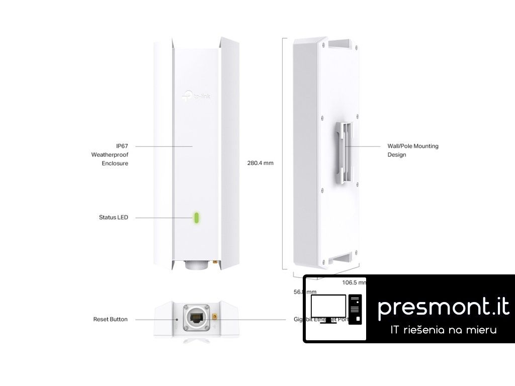 TP-Link EAP623-Outdoor HD AX1800 vnitřní/venkovní Wi-Fi 6 přístupový bod AX1800 Wi-Fi 6 (802.11ax) access point je díky konstrukci, možnostem napájení a instalace vhodný pro nejrůznější scénáře použití. Je ideální zejména do rozsáhlých venkovních oblastí s vysokou hustotou provozu. Profesionální antény s výkonným zesilovačem a horizontální i vertikální polarizací využívají technologii Wi-Fi 6, aby zesílily a prodloužily bezdrátové pokrytí v různých venkovních prostředích. Technologie OFDMA a MU-MIMO významně zlepšují použití v místech s větším počtem uživatelů, neboť dokáží souběžně spolehlivě obsloužit desítky klientů na rozlehlých, otevřených místech (vysoce efektivní bezdrátové připojení v přeplněných sítích). * vysokorychlostní Wi-Fi 6 s velkých dosahem - dvoupásmová rychlost 574 Mbit/s na 2,4 GHz + 1201 Mbit/s na 5 GHz * konektivita s vysokou hustotou klientů - až pro 1000+ klientů * pokrytí na dlouhým dosahem díky vysoce výkonnému zesilovači a chytrým anténám * technologie Omada Mesh - umožňuje bezdrátové připojení mezi přístupovými body pro větší dosah a flexibilní nasazení * chytré antény - horizontálně a vertikálně polarizované antény - inteligentní algoritmy zařízení automaticky vybírají optimální antény, což přináší nižší rušení, delší pokrytí a vyšší výkon * pouzdro odolné povětrnostním vlivům - krytí IP67 prachuvzdornost (zcela prachotěsné) a voděodolnost (IP68 - i delší kontakt se sladkou vodou), 6kV ochrana před bleskem * centralizovaná správa cloudu -díky integraci do platformy Omada SDN můžete celou síť spravovat lokálně nebo přes cloud prostřednictvím webového rozhraní nebo aplikace Omada * technologie PoE - podpora standardu 802.3at PoE+ s max. výkonem 30W a pasivního PoE pro flexibilní instalaci (adaptér není součástí balení) Technické parametry Síťové rozhraní: * 1x LAN port GbE (100/1000Mb/s) RJ-45 Wi-Fi standard: IEEE 802.11a/b/g/n/ac/ax Frekvenční pásmo: 2,4 GHz, 5 GHz Rychlost datového přenosu: 2,4 GHz - 574 Mbit/s, 5 GHz - 1201 Mbit/s Celková propustnost: 1,8 Gb/s Počet podporovaných klientů: 1000+ Šifrování-zabezpečení: WPA-Personal/Enterprise, WPA2-Personal/Enterprise, WPA3-Personal/Enterprise Modulace: 1024 QAM, OFDMA Počet antén: 2 interní dvoupásmové všesměrové antény Zisk antény: 4 dBi (2,4 GHz), 5 dBi (5 GHz) Polarizace antén: vertikální a horizontální Napájení: 802.3at PoE nebo pasivní PoE (48 V) Max. spotřeba energie: 12,5 W (802.3at PoE nebo pasivní PoE) Hardware Integrované GPS a Bluetooth: ne Tlačítko: reset Rozměry (: 280,4 × 106,5 × 56,8 mm Hmotnost: 789 g Materiál pouzdra/stojanu: polykarbonát (PC) Barva: bílá Provozní teplota (°): -30 až -70 Provozní vlhkost: 10 až 90 % bez kondenzace Provedení: na sloup, na zeď Použití: venkovní (i vnitřní) Obsah balení: * AP EAP623-Outdoor HD * montážní sada * sada pro voděodolnost * instalační příručka - balení neobsahuje PoE injektor Záruka: 60 měs. Odkaz na stránku výrobce: https://www.omadanetworks.com/cz/business-networking/omada-wifi-outdoor/eap623-outdoor-hd/#specificationsDodatočné parametre
