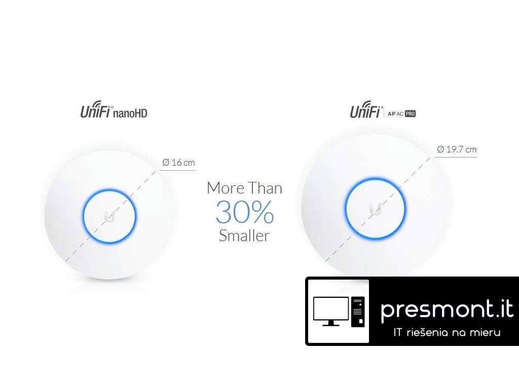 Popis produktu Zařízení je součástí kompletní řady výrobků UniFi, podporuje standardy 802.11a/g/b/n/ac/ac-wave2, kdy používá jak pásmo 2,4GHz, tak i 5GHz a to s modulačními rychlostmi 300Mbps a 1733Mbps. K podpoření výkonu bezdrátové části je UAP vybaveno jedním Gigabit ethernetovým portem, který je kompatibilní s PoE standardem 802.3af. Maximální výkon 2,4GHz rádiové části je 23dBm a 26dBm v pásmu 5GHz. Šifrování pomocí WPA2 je dnes již samozřejmostí. Výhody MU-MIMO technologie Díky MU-MIMO (MultipleUser - Multiple In - Multiple Out) technologii je UAP-nanoHD schopno komunikovat s několika zařízeními ve stejný čas: 4 klienti 1x1 2 klienti 2x2 1 klient 2x2 + 2 klienti 1x1 1 klient 3x3 + 1 klient 1x1 Volitelné šasi Jako první z rodiny UniFi bude mít tento model volitelné šasi, které bude možné dokoupit a bude na výběr z celkem 6ti různých vzorů - mramor, matná černá, beton, dřevo, tkanina a vojenské maskování. Velmi malé rozměry UAP-nanoHD je nejmenší přístupový bod UniFi. Je o 30% menší než verze UAP AC Pro a přibližně stejně veliký jako UAP-AC-Lite. Komplexní řídící SW pro všechny produkty UniFi K zařízení je potřeba stáhnout z oficiálních stránek originální software nazývaný UniFi Network application, díky kterému lze řídit celou síť. Nespornou výhodou UniFi Network application je, že je zcela zdarma bez jakéhokoliv omezení! Tento centrální management umožní nahrávat mapy a nastavit základní parametry jako například SSID, guest účet, úvodní stránku, statistiky provozu i seznam a status asociovaných klientů vždy snadno a rychle. Výhody UniFi řešení * Zero Handoff Roaming - bezvýpadkový přechod mezi jednotlivými AP * Wireless uplink (hodí se tam, kam není možné dostat datový kabel) * až 4 SSID * detailní statistiky provozu * Guest síť * Voucher system * Load balance - udržování rovnoměrné zátěže/přepínání klientů * omezování rychlosti pro každé SSID Obsah balení * (5) zařízení * (5) montážní úchyty na strop a zeď * (5) sada šroubků a hmoždinek Technické parametry Bezdrátové vlastnosti Bezdrátové frekvence: 2,4 + 5GHz (dual band) Přenosová rychlost WiFi - 2,4GHz [Mb/s]: 300 Přenosová rychlost WiFi - 5GHz [Mb/s]: 1733 WiFi standardy: 802.11ac, 802.11n, 802.11a,802.11b/g Vysílací výkon 2,4GHz [dBm]: 23 Vysílací výkon 5GHz [dBm]: 26 Šifrování: WEP, WPA, WPA2 2,4GHz MIMO: 2x2 5GHz MIMO: 4x4 Typ antény: Vestavěná Počet vestavěných antén: 4 Zisk antény [dBi]: 3 Fyzické charakteristiky Použití: Vnitřní Tlačítka: Reset Provozní teplota [°C]: -10 až 70 Hmotnost [g]: 300 Hloubka [mm]: 160 Šířka [mm]: 160 Výška [mm]: 33 Konektory a rozhraní Rychlosti LAN: (1) 10/100/1000Mbps Gigabit LAN: Ano Napájení Max. spotřeba energie [W]: 10,5 Napájení přes PoE: 802.3af, 48V DC Typy PoE: Vstupní Software Operační mód: Access Point Podpora IPv6: Transparentní (režim bridge) Výchozí IP adresa: Dynamická z DHCP Výchozí jméno a heslo: Ubiquiti/UbiquitiDodatočné parametre