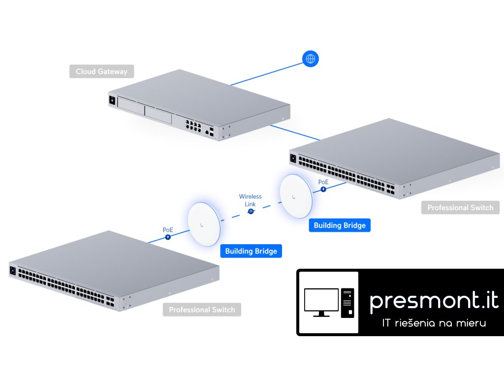 Ubiquiti UniFi Building-to-Building Bridge (UBB) Výkonný bezdrátový most Ubiquiti UniFi Building-to-Building Bridge (UBB) je ideálním řešením pro propojení dvou budov pomocí vysokorychlostního 60GHz spoje s automatickým záložním 5GHz rádiem. Nabízí rychlost až 1,7 Gbps, dosah až 500 metrů a snadnou správu v prostředí UniFi. Klíčové vlastnosti Bezdrátový PtP most s technologií 60 GHz + záložní 5 GHz Maximální rychlost až 1,7 Gbps (60 GHz) Dosah až 500 m 2×2 MU-MIMO (5 GHz) Napájení přes PoE (adaptér součástí balení) Odolnost vůči povětrnostním vlivům IPX6 Správa přes Ethernet a Bluetooth Montáž na zeď nebo stožár Výkon a bezdrátové parametry WiFi standard: WiFi 5 (802.11ac) Prostorové streamy: 2 MIMO (5 GHz): 2×2 DL MU-MIMO Max. přenosová rychlost: * 60 GHz: 1,7 Gbps * 5 GHz (BW80): 866,6 Mbps Zisk antény: * 60 GHz: 17,2 dBi * 5 GHz: 10 dBi * 2,4 GHz (BLE): 2 dBi Max. vysílací výkon: * 60 GHz: 19 dBm * 5 GHz: 25 dBm Zabezpečení: WPA2 AES Podporované standardy a rychlosti * 802.11ac (WiFi 5): 6,5 Mbps – 867 Mbps (MCS0–MCS9, NSS1/2, VHT 20/40/80) * 802.11n: 6,5 Mbps – 300 Mbps (MCS0–MCS15, HT 20/40) * 802.11a/g: 6 – 54 Mbps * 802.11b: 1 – 11 Mbps Hardware Port: 1× GbE RJ45 Max. spotřeba: 11 W Napájení: PoE (44–57 V DC) Tlačítko: Factory reset LED indikace: RGB stavová LED Materiál: UV odolný polykarbonát Hmotnost: 376 g Frekvence a šířka kanálu Hlavní rádio (60 GHz): 57 – 66 GHz (šířka kanálu 1 080 / 2 160 MHz) Záložní rádio (5 GHz): 5150 – 5850 MHz (HT 20/40, VHT 20/40/80 MHz) Bluetooth: 2400 – 2483,5 MHz Odolnost a provozní podmínky Krytí: IPX6 Provozní teplota: -40 až 70 °C Provozní vlhkost: 5–95 % (nekondenzující) Odolnost proti větru: 56 N při 200 km/h Instalace a správa * Provozní režim: Point-to-Point (PtP) * Montáž: zeď nebo stožár * Správa přes Ethernet nebo Bluetooth * NDAA Compliant * Certifikace: CE, FCC, IC UniFi Building-to-Building Bridge je ideálním řešením pro rychlé a stabilní propojení dvou objektů bez nutnosti pokládky kabeláže. Díky kombinaci 60GHz vysokorychlostního spoje a 5GHz zálohy poskytuje maximální stabilitu i v náročných podmínkách. Odkaz na web výrobce: https://techspecs.ui.com/unifi/wifi/ubbDodatočné parametre