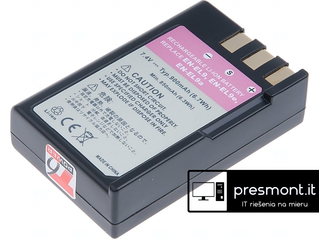 Typ: Li-ion Kapacita: 1000 mAh (7.4 Wh) Barva: černá Napětí: 7.4 V Rozměry: 55.9x36.05x14.3 mm Hmotnost: 50.5 g Produktová čísla: EN-EL9, EN-EL9a, EN-EL9e Kompatibilní modely: Nikon D3000, Nikon D40, Nikon D40x, Nikon D5000, Nikon D60Dodatočné parametre