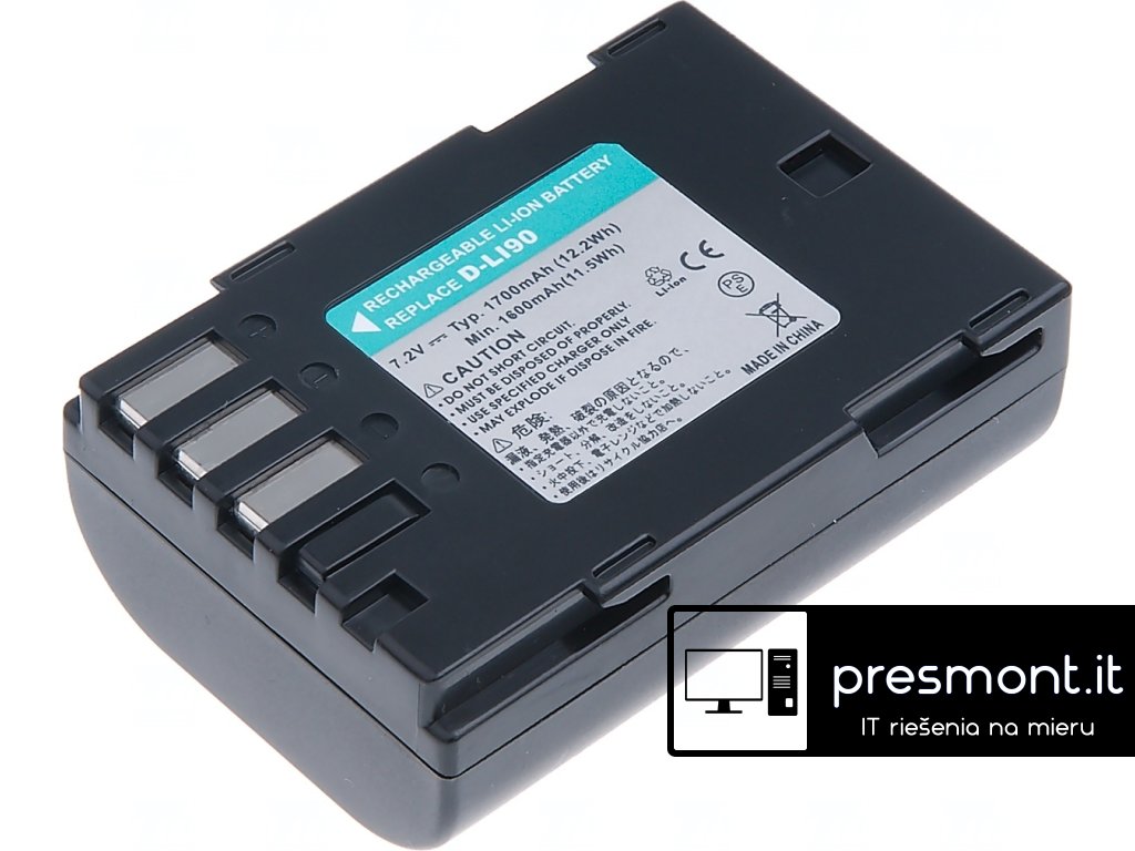 Typ: Li-ion Kapacita: 1620 mAh (11.7 Wh) Barva: černá Napětí: 7.2 V Rozměry: 56.75x39.1x20.9 mm Hmotnost: 80.4 g Produktová čísla: D-Li90 Kompatibilní modely: Pentax 645D, Pentax 645Z, Pentax K-01, Pentax K-3, Pentax K-5, Pentax K-5 II, Pentax K-5 Iis, Pentax K-7, Pentax K-1, Pentax K-3 IIDodatočné parametre