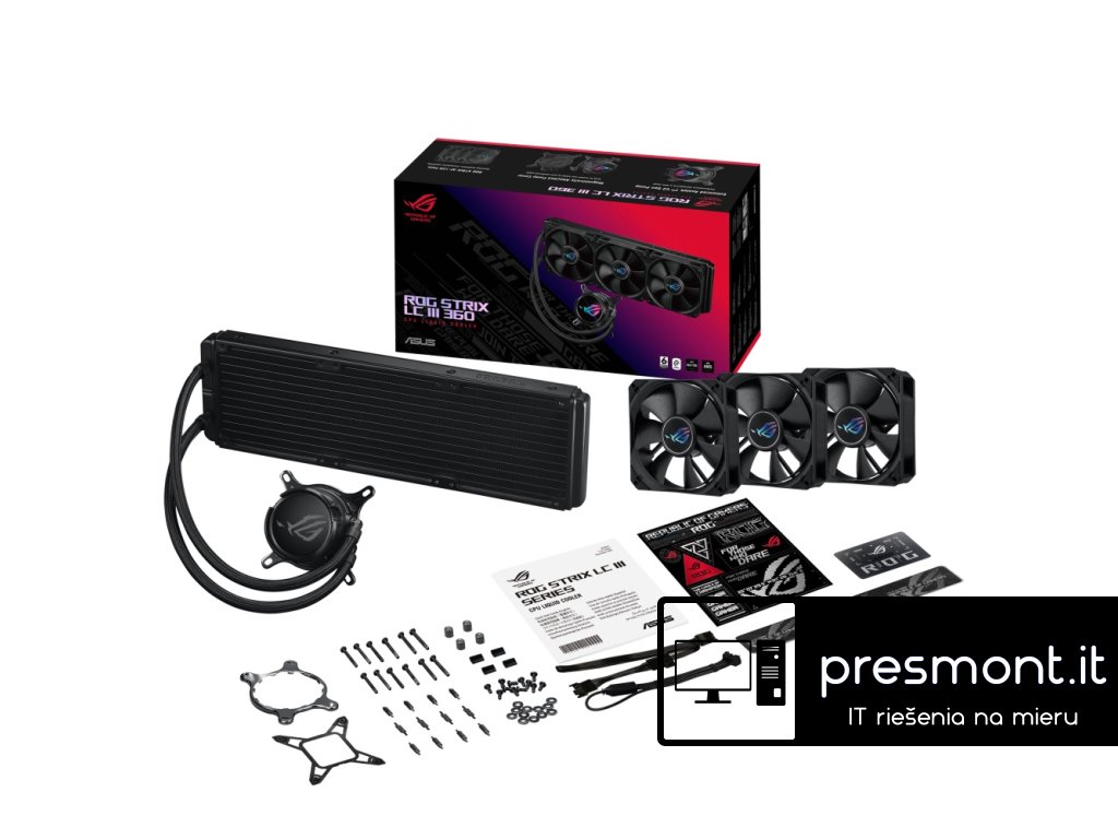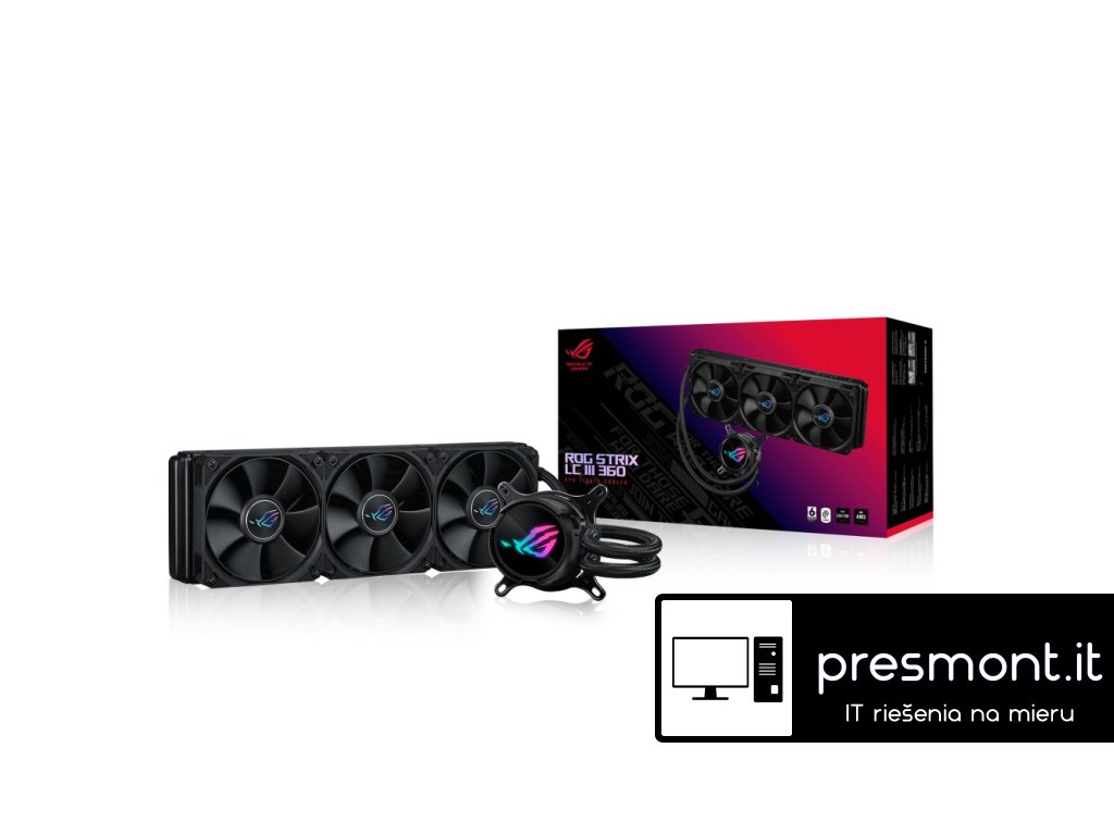 Asus ROG Strix LC III 360 * technologie 0dB * antivibrační guma * vodní blok otočný o 360° * podpora AURA Sync Vodní blok Rozměry: 72x72x61mm Materiál (deska CPU): měď Čerpadlo Řešení čerpadla: čerpadlo Asetek 7. generace V2 Rychlost motoru: 800-2800 +/- 10% RPM Chladič Rozměry: 394x121x27mm Materiál: hliník Trubice: gumová obalená pletenou síťovinou Délka trubice: 400mm Ventilátor ROG STRIX AF-12S FAN Velikost: 3x slot pro ventilátor (120mm) Rozměry: 120x120x25mm Rychlost: 800-2200RPM +/- 10% (podpora 0RPM) Statický tlak: 3,92mm H20 Proud vzduchu: 70,38CFM Hluk: 36dB(A) Režim ovládání: PWM/DC Kompatibilita * Intel: LGA 1700, 1200, 115x * AMD: AM5, AM4 Obsah balení * 1x CPU Liquid Cooler (předem aplikovaná tepelná směs) * 3x 120mm ventilátor chladiče * 1x 1-3 fan splitter kabel * 1x sada příslušenství se šrouby a držáky * 1x rychlý průvodce * 1x nálepka ROG * 1x ROG organizér kabelů * 1x ROG VIP karta Záruka: 6 let Odkaz na stránky výrobce: https://rog.asus.com/cooling/cpu-liquid-coolers/rog-strix-lc/rog-strix-lc-iii-360/Dodatočné parametre