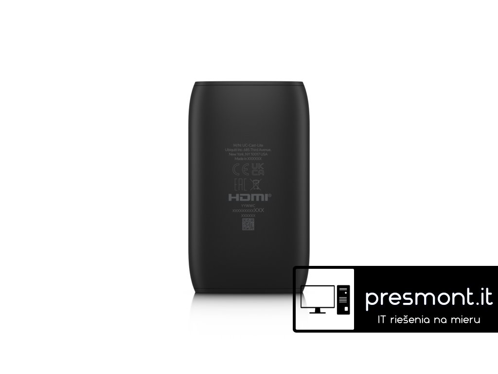 UniFi Display Cast Lite zařízení určené k přehrávání videí a fotografií na televizi či monitoru přes HDMI * připojení k libovolnému displeji kompatibilnímu s HDMI * napájení adaptérem USB-C Technické parametry Procesor: čtyřjádrový Arm® Cortex®-A55, 1,9GHz Paměť * úložiště: 16GB * RAM: 2GB Porty: * 1x HDMI * 1x napájecí konektor USB-C Napájení USB-C: 5V DC, 1A WiFi standard: 802.11 a/b/g/n/ac/ax Konektivita: * WiFi 2,4G, BW 20/40 MHz * WiFi 5G, BW 20/40/80 MHz Rozměry * bez držáku: 90x52x31mm * s držákem: 92,1x56,3x40,8mm Hmotnost * bez držáku: 160g * s držákem: 180g Obsah balení: * Display Cast Lite * držák na zeď * montážní sada (šroubky a hmoždinky) * 2x stahovací páska * vrtací šablona * USB-C napájecí adaptérDodatočné parametre