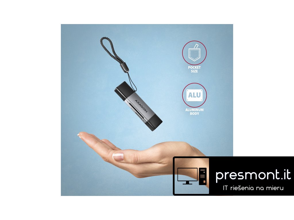 Mobilní Mini čtečka paměťových karet AXAGON CRE-DAC s rozhraním USB 5 Gbps podporuje všechny současné verze SD a microSD karet včetně SDXC a microSDXC s kapacitou až 2TB. Velkou výhodou čtečky je jak konektor USB-C, tak i konektor USB-A, připojení je tak opravdu univerzální. Čtečku je možné přímo připojit ke všem stolním počítačům nebo notebookům a také k telefonům a tabletům s USB-C konektorem. Díky USB 3.2 Gen 1 (USB 3.0) rozhraní dosahuje čtečka výrazně vyšších přenosových rychlostí u karet SD UHS-I oproti čtečkám s USB 2.0 rozhraním. Čtečka potěší možností současné práce s kartami v obou slotech a přímého kopírování mezi nimi. Kovové tělo čtečky nejen skvěle vypadá, ale zvyšuje také její odolnost. Potěší také jemně strukturovaný povrch, na kterém nezůstávají otisky prstů. Oba konektory jsou při přenášení chráněny krytkami. Přibalený závěs umožní připnutí čtečky třeba ke svazku klíčů. Instalaci zvládne každý, čtečku jen zasunete do USB portu počítače nebo telefonu a zbytek proběhne zcela automaticky. Čtečka karet - dva sloty, podporuje následující formáty: • slot Micro SD: microSD / microSDHC / microSDXC / TransFlash, • slot SD: SecureDigital, SDHC, SDXC, MultiMedia Card, MMC 4.0, MMC Dual Voltage, MMC mobile, RS-MMC, s adaptérem miniSD, microSD, microSDHC, microSDXC, MMC Micro. Čtečka podporuje tyto specifikace flash karet: • SD 1.0/1.1 (SD - Secure Digital, až 2GB). • SD 2.0 (SDHC - Secure Digital High Capacity, až 32GB). • SD 3.0 (SDXC - Secure Digital eXtended Capacity, až 2TB). • MMC a eMMC 3.x/4.0/4.1/4.2/4.3/4.4/4.5/5.0 (8-bit). • Podpora SD 3.01 a SD Jukebox aplikace (CPRM funkce). • Podpora Ultra High Speed bus UHS-I (SDR12/SDR25/SDR50/DDR50/SDR104) rychlost až 104 MB/s. • Podpora hardware ECC (Error Correction Code) funkce a CRC (Cyclic Redundancy Check) funkce. • 2 LUN - v souborových manažerech se čtečka indikuje jako dvě diskové jednotky. • Podpora souborových formátů FAT 12/16/32, NTFS, exFAT (FAT 64). Další vlastnosti: • Rozhraní SuperSpeed USB - USB 3.2 Gen 1 (dříve USB 3.1 Gen 1 / USB 3.0). • Kompatibilní také s USB 3.2 Gen 2, zpětně kompatibilní s USB 2.0 a USB 1.1. • Podpora přenosových rychlostí 1.5 / 12 / 480 / 5000 Mbit/s (low / full / high / super speed). • Plná podpora Plug and Play a Hot Swap. • Připojení přes USB konektor typu C male nebo typu A male. • Podpora připojení telefonů s microUSB konektorem přes OTG redukci. • Napájení čtečky po USB sběrnici (bus-power). • LED dioda indikuje připojení čtečky k počítači. • Rozměry 70 x 17 x 10 mm s nasazenými krytkami. • Hmotnost 14 g. Podporované operační systémy: • MS Windows 7 / 8 / 8.1 / 10 / 11 a novější, Windows Server 2008 / 2012 / 2016 / 2019 / 2022 a novější (podporovány všechny 32- i 64-bitové verze OS Windows), Mac OS X 10.x a vyšší, Linux s jádrem 2.4.x a vyšším, Android všechny verze. • Pozn.: Ovladače jsou součástí podporovaných operačních systémů a nainstalují se zcela automaticky. Žádné jiné ovladače není třeba instalovat a nejsou ani k dispozici. Balení v kartonové krabičce s otvorem pro zavěšení obsahuje: • SuperSpeed USB čtečku karet, • 2 krytky USB konektorů, • závěs na klíče, • vícejazyčný návod CZ/DE/DK/ENG/ESP/FIN/FR/GR/HR/HU/IT/NL/PL/PT/RO/RU/SK/SWE/BG/CN/TR/ARA.Dodatočné parametre
