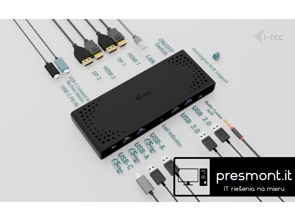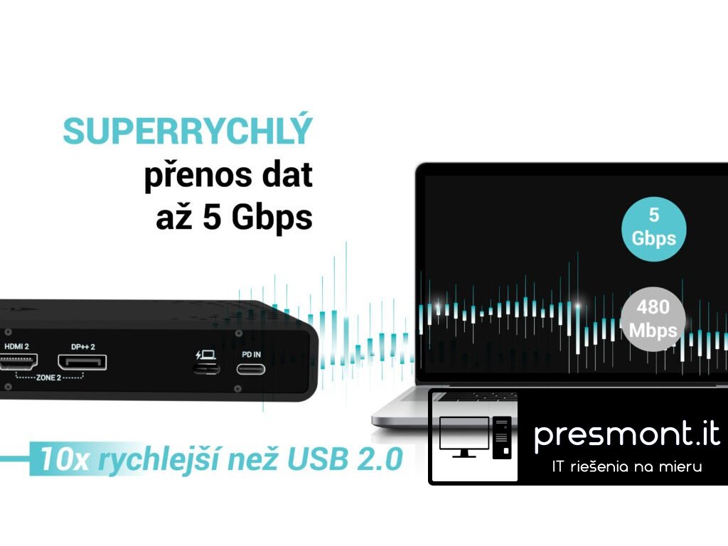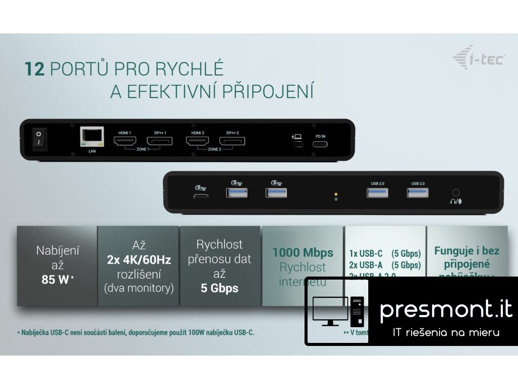 • Univerzální dokovací stanice kompatibilní s notebooky a tablety s rozhraním USB-C, USB-A, USB4 a Thunderbolt. • 2x DisplayPort a 2x HDMI podporující až dva displeje 4K/60Hz (platí i pro platformu Apple M1/M2/M3) nebo jeden displej 5K/60Hz. • 5x port USB včetně 1x USB-C 3.1 (5 Gbps, s podporou rychlého nabíjení BC 1.2) a 2x USB-A 3.1 (5 Gbps, s podporou rychlého nabíjení BC 1.2), což usnadňuje připojení více USB zařízení a periferií pro rychlý přenos dat. • Dokovací stanici je možné provozovat i bez USB-C nabíječky, a to i v případě připojení k notebooku přes USB-A konektor • Poskytuje až 85W Power Delivery pro kompatibilní notebooky a tablety s rozhraním USB-C, USB4 a Thunderbolt. • GLAN Ethernet podporuje síťové rychlosti 10/100/1000 Mbps, čímž poskytuje robustní a vysokorychlostní připojení k internetu. • Samostatné 3,5mm audio vstupní a výstupní konektory pro snadné připojení náhlavní soupravy nebo reproduktorů. • Možnost instalace držáku VESA, který vám pomůže udržet pořádek na stole a zbavit se kabelů, a slot K-lock pro větší bezpečnost. Poznámka: USB-C nabíječka není součástí dodávky. Dokovací stanici lze používat bez nabíječky, nebo s nabíječkou dodanou např. s vaším notebookem, případně lze nabíječku zakoupit samostatně, například i-tec CHARGER-C100W. Alternativně můžete zakoupit produktovou sadu CADUA4KDOCKPDB100, který již obsahuje napájecí zdroj. Výkonná, přitom cenově dostupná dokovací stanice, která podporuje výstup až na dva externí monitory ve vysokém rozlišení, a to až 4K/60 Hz. Dokovací stanici lze použít prakticky se všemi notebooky, protože podporuje připojení ke všem běžným portům: 3.0, USB-C, USB4 a Thunderbolt“ 3/4 a zároveň podporuje všechny běžné současné operační systémy. Dostatek portů, spolehlivé a rychlé připojení k firemní síti díky integrovanému portu LAN a podpora instalace za monitor, to vše dělá z této dokovací stanice ideálního společníka pro opravdové profesionály. Dokovací stanici lze používat při pouhém připojení k notebooku (bez připojení USB-C nabíječky), případně za použití USB-C nabíječky (není součástí balení). V takovém případě podporuje nabíjení notebooku nebo tabletu, a to až do výkonu 85 W. • Připojení 2 externích monitorů v rozlišení až 4K/60Hz • Power Delivery: až 85W (v případě použití USB-C nabíječky o výkonu 100W, není součástí balení) • K dispozici 2 porty DisplayPort a 2 porty HDMI • 2x USB 3.1 Gen 1 (5 Gb/s), 2x USB 2.0 a 1x USB-C Gen 1 (5 Gb/s) umožňují snadné připojení vašich USB zařízení a periferií • Gigabitový Ethernet RJ-45 poskytuje spolehlivé, robustní a vysokorychlostní připojení k internetu s podporou rychlostí 10/100/1000 Mb/s • Kombinovaný konektor pro zvuk a mikrofon • Zámek Kensington poskytuje ochranu proti krádeži, zejména ve sdíleném kancelářském prostředí nebo na veřejných místech • Vypínač napájení dokovací stanice umožňuje maximální úsporu energie • Dokovací stanice podporuje držák VESA pro inteligentní vertikální instalaci za monitor s podporou VESA • Podporuje systémy Windows 10 / 11, macOS, Android 5 nebo novější, Chrome OS R51 nebo novější, Linux Ubuntu Pokud je dokovací stanice připojena přes port USB 3.0, nabíjení není podporováno. Specifikace • 1x USB-C port pro připojení k zařízení s USB-C nebo USB-A rozhraním (propojovací kabel USB-C a adaptér USB-C na USB-A jsou součástí balení) • Technologie dokovací stanice: DisplayLink + USB-C PD • Power Delivery: 85W Video porty: • 2x HDMI • 2x DP (podporující DP++) Rozlišení: • 1 monitor – 1x DP/HDMI › až 4K/60Hz • 1 monitor – 2x DP › až 5K/60Hz* • 2 monitory – 1x DP/HDMI + 1x DP/DHMI › až 2x 4K/60Hz • 1x USB-C vstup pro napájecí adaptér (není součástí balení) • 1x USB-C 3.2 Gen.1 port s podporou rychlého nabíjení (BC 1.2)** • 2x USB 3.2 Gen.1 port s podporou rychlého nabíjení (BC 1.2)** • 2x USB 2.0 port • 1x Ethernet GLAN RJ-45 port (DisplayLink DL-6950) • 1x 3,5mm kombinovaný audio konektor • Klonování MAC adresy: ano (za použití software i-tec Docker Pro) • WOL: S1, S2, S3 • Podpora pro Kensington lock • Podpora pro VESA uchycení • Kabel USB-C na USB-C/USB-A (100 cm) • OS: Windows 10 / 11, macOS 11 nebo novější, Android 5 nebo novější, Chrome OS R51 nebo novější, Linux Ubuntu • Jednoduchá instalace ovladačů ((Windows, macOS, Ubuntu, Android (external link)) • Rozměry produktu: 223.8 x 83.4 x 27.1 mm • Hmotnost produktu: 340 g • Rozměry balení: 238 x 129 x 65 mm • Hmotnost balení: 520 g * 5K rozlišení podporuje pouze Windows ** Podpora rychlého nabíjení pouze pro jedno připojené zařízení Hardwarové požadavky: Zařízení s volným portem USB-A, USB-C, USB4 nebo Thunderbolt™ 3/4. Požadavky pro funkci Power Delivery: Zařízení s volným portem USB-C, USB4 nebo Thunderbolt™ 3/4 s podporou Power Delivery Operační systém: Windows 10 / 11, macOS 11 nebo novější, Android 5 nebo novější, Chrome OS R51 nebo novější, Linux Ubuntu V případě, že je dokovací stanice připojena přes USB 3.0, nabíjení notebooků a tabletů nepodporuje * Nabíjení externích zařízení je podporováno pouze v případě, že je dokovací stanice připojená k hostitelskému zařízení. Obsah balení • Produkt • Propojovací kabel USB-C a adaptér USB-C na USB-A (100cm) • ManuálDodatočné parametre