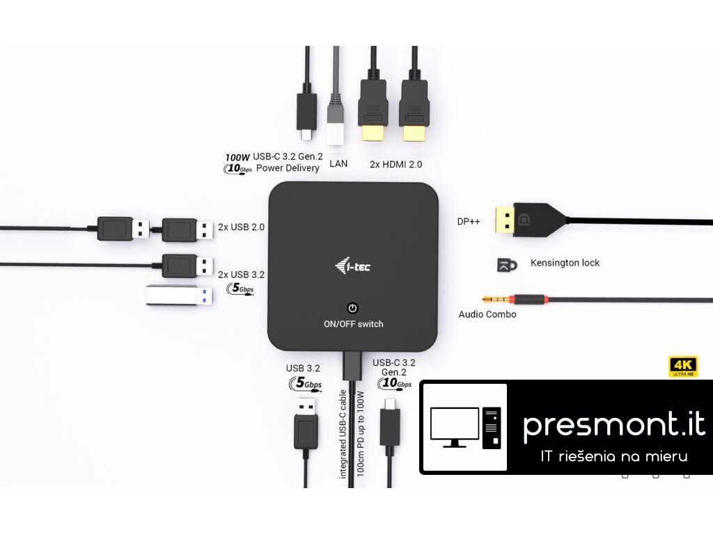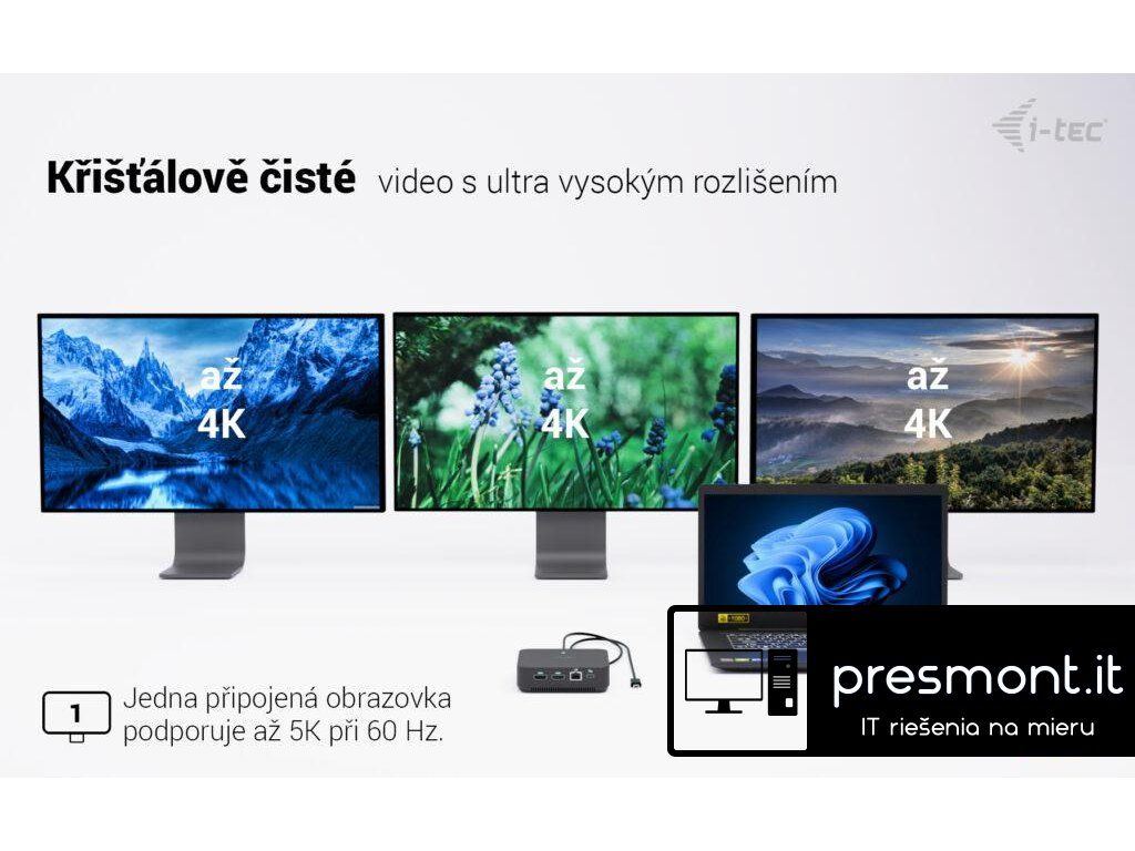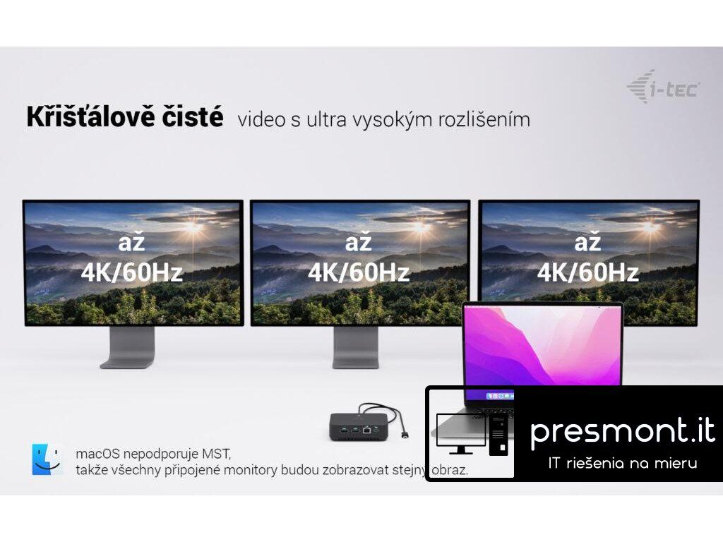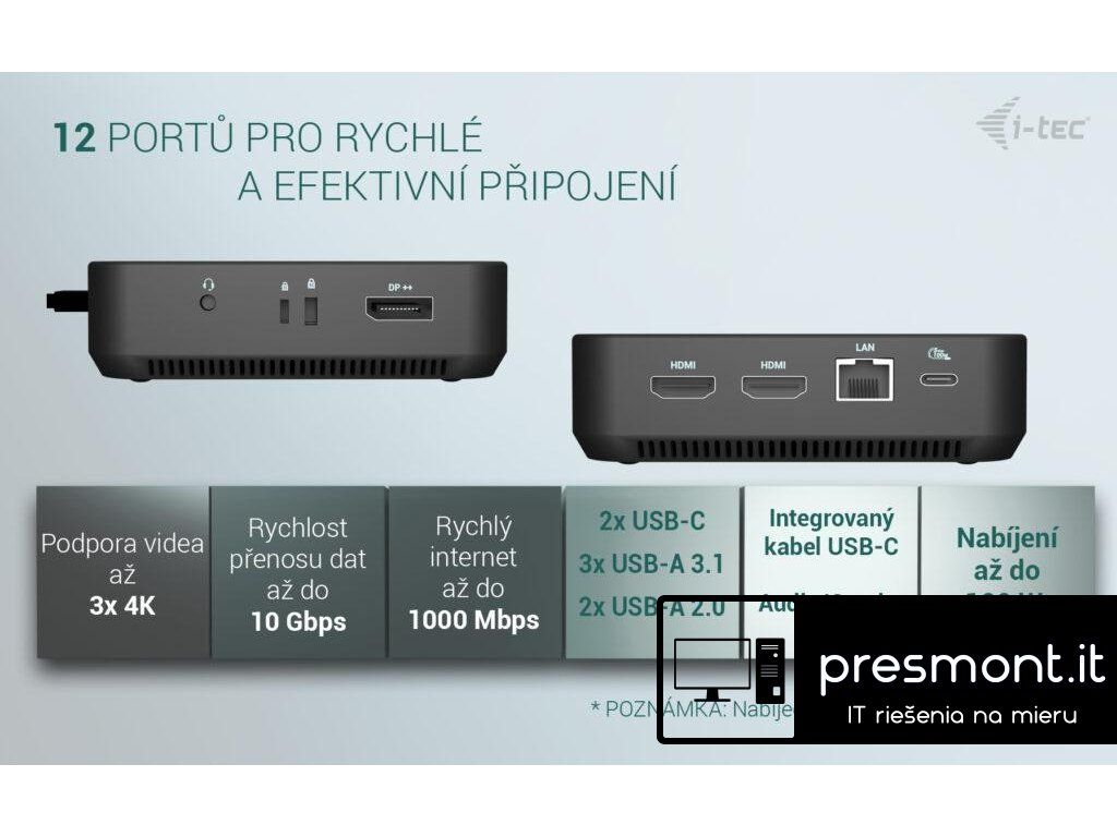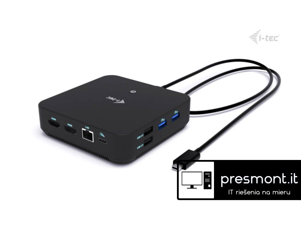 • Kompatibilní s notebooky a tablety s USB-C, USB4 a Thunderbolt rozhraním. (Hostitelské zařízení musí podporovat režim DisplayPort Alt.) • 2× HDMI a 1× DisplayPort++ s podporou až tří monitorů s rozlišením 4K nebo jednoho monitoru s rozlišením 5K/60 Hz (v závislosti na výkonu notebooku). macOS podporuje pouze jeden rozšířený displej. • 6× USB portů (5× USB-A, 1× USB-C) pro snadné připojení více USB zařízení a periferií. • Poskytuje napájení až 100 W prostřednictvím Power Delivery pro kompatibilní zařízení s USB-C, USB4 a Thunderbolt. • Hostitelské zařízení musí podporovat USB-C Power Delivery. • GLAN Ethernet podporuje síťové rychlosti 10/100/1000 Mb/s a zajišťuje stabilní a vysokorychlostní připojení k internetu. • Kombinovaný 3,5mm audio vstup/výstup pro snadné připojení sluchátek nebo reproduktorů. • K dispozici držák VESA pro udržení pořádku na pracovním stole a snížení počtu kabelů, slot pro zámek K-lock pro vyšší bezpečnost. • Energeticky úsporný vypínač pro snížení spotřeby energie, pokud dokovací stanice není používána. Poznámka: Napájecí adaptér není součástí balení. Dokovací stanici lze napájet originálním adaptérem notebooku, nebo je možné dokoupit volitelný napájecí adaptér (kód i-tec: CHARGER-C100W). Vysoce výkonná kancelářská dokovací stanice USB-C s podporou až 3 externích monitorů s rozlišením 4K. Stanice je kompatibilní s jakýmkoli notebookem vybaveným portem USB-C, USB4 nebo Thunderbolt 3/4/5. Samozřejmostí je také možnost nabíjení notebooku či tabletu výkonem až 100 W. Integrovaný moderní protokol DP 1.4 DSC navíc podporuje rozlišení až 5K při 60 Hz, což ocení profesionální grafici, datoví analytici, střihači videa nebo milovníci obrazu ve vysokém rozlišení. Dokovací stanici lze zakoupit ve dvou variantách: • bez přiloženého USB-C napájecího adaptéru (kód produktu: C31TRIPLEVIDEODPPRO – tato verze) • s přiloženým napájecím adaptérem 100 W (kód produktu: C31TRI4KDPDPRO100) Poznámka: Operační systém macOS nepodporuje technologii přenosu videa Multi Stream Transport (MST), což znamená, že při připojení k systému macOS bude na všech připojených monitorech zobrazen stejný obraz. • Možnost připojení až tří externích monitorů s rozlišením 4K • Obnovovací frekvence až 240 Hz (při připojení jednoho monitoru s rozlišením 1440p) • Power Delivery: až 100 W • 2× HDMI, 1× DisplayPort++ • 3× USB 3.2 (5 Gb/s), 1× USB-C 3.2 Gen 2 (10 Gb/s) a 2× USB 2.0 pro snadné připojení periferií a USB zařízení • Gigabitový Ethernet RJ-45 poskytuje spolehlivé, stabilní a vysokorychlostní připojení • Kombinovaný audio konektor (sluchátka/mikrofon) na předním panelu • Zámek Kensington poskytuje ochranu proti krádeži, zejména ve sdílených kancelářích a veřejných prostorách • Vypínač pro úsporu energie při nepoužívání stanice • Možnost montáže pomocí držáku VESA – vertikální instalace za monitor kompatibilní s VESA • Podporované operační systémy: Windows 10/11, macOS, Android, iPadOS, ChromeOS a Linux Stanici lze používat i bez připojeného napájecího adaptéru. V takovém případě budou vždy funkční video výstupy, LAN (RJ-45), audio/mikrofon a oba porty USB 2.0. Porty USB 3.2 a datový port USB-C však nemusí fungovat při připojení zařízení s vyššími nároky na napájení (např. SSD disky, zejména NVMe). V takovém případě se může stanice vypnout. Doporučujeme proto používat stanici s připojeným napájecím adaptérem, aby bylo zajištěno plné využití všech portů a dosažení maximálních přenosových rychlostí. (Při připojení k zařízení s Androidem funguje stanice pouze s připojeným napájecím adaptérem.) POZNÁMKA: USB-C nabíječka není součástí balení. Pokud požadujete dokovací stanici s přiloženou nabíječkou, zvažte verzi s kódem produktu C31TRIVIDPRO100W. Specifikace : • 1× integrovaný USB-C kabel pro připojení k hostitelskému zařízení (100 cm) • Technologie dokovací stanice: USB-C (MST) + USB-C Power Delivery • Power Delivery: až 100 W • Vnitřní spotřeba energie: 5–10 W • Video výstupy: 2× HDMI 2.0, 1× DisplayPort 1.4 Podporovaná rozlišení: Zařízení s podporou DisplayPort 1.2: • 1 monitor – 1× HDMI nebo DP › až 4K/30 Hz • 1 monitor – 1× HDMI nebo DP › až 1080p/120 Hz • 2 monitory – 1× DP + 1× HDMI › až 2× 1080p/60 Hz* • 2 monitory – 2× HDMI › až 2× 1080p/60 Hz* • 3 monitory – 1× HDMI + 1× HDMI + 1× DP › až 1× 1080p/60 Hz + 2× 720p/60 Hz* Zařízení s podporou DisplayPort 1.4: • 1 monitor – 1× HDMI › až 4K/60 Hz nebo 1440p/144 Hz • 1 monitor – 1× DP › až 4K/60 Hz nebo 1440p/165 Hz • 2 monitory – 1× DP + 1× HDMI › až 2× 1440p/60 Hz* nebo 4K/30 Hz* • 2 monitory – 2× HDMI › až 2× 1440p/60 Hz* nebo 4K/30 Hz* • 3 monitory – 1× HDMI + 1× HDMI + 1× DP › až 3× 1080p/60 Hz* Zařízení s podporou DisplayPort 1.4 + DSC: • 1 monitor – 1× HDMI › až 4K/60 Hz nebo 1440p/144 Hz • 1 monitor – 1× DP › až 5K/60 Hz, 4K/120 Hz nebo 1440p/240 Hz • 2 monitory – 1× DP + 1× HDMI › až 2× 4K/60 Hz* nebo 1440p/144 Hz* • 3 monitory – 1× HDMI + 1× HDMI + 1× DP › až 3× 4K/30 Hz* • 1× USB-C 3.2 Gen 2 port (10 Gb/s) • 1× USB-C 3.2 Gen 2 port (10 Gb/s) s podporou Power Delivery • 3× USB-A 3.2 Gen 1 port (5 Gb/s) • 2× USB 2.0 port • 1× Ethernet GLAN RJ-45 port • 1× kombinovaný 3,5mm audio port (sluchátka/mikrofon) • LED indikace • Vypínač pro zapnutí/vypnutí dokovací stanice • Podpora klonování MAC adresy (pomocí softwaru i-tec Docker Pro) • Podpora zámku Kensington • Podporované operační systémy: Windows 10/11, macOS*, Android*, iPadOS*, ChromeOS, Linux 