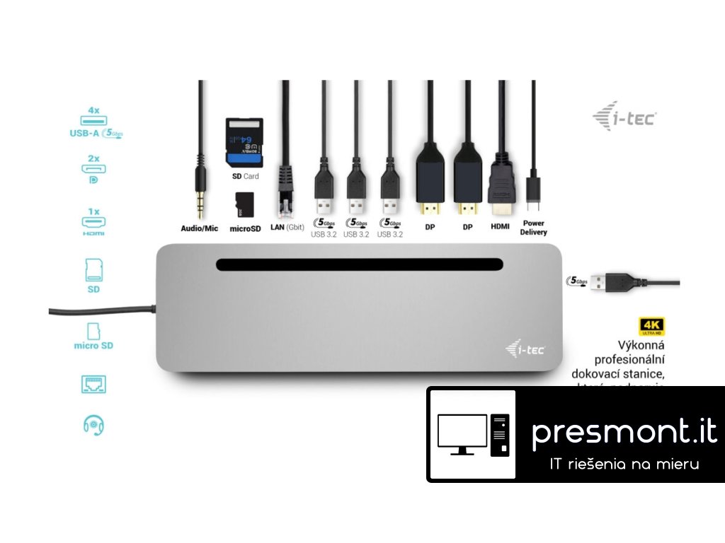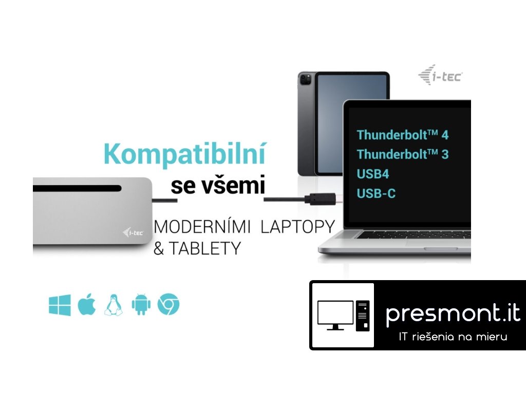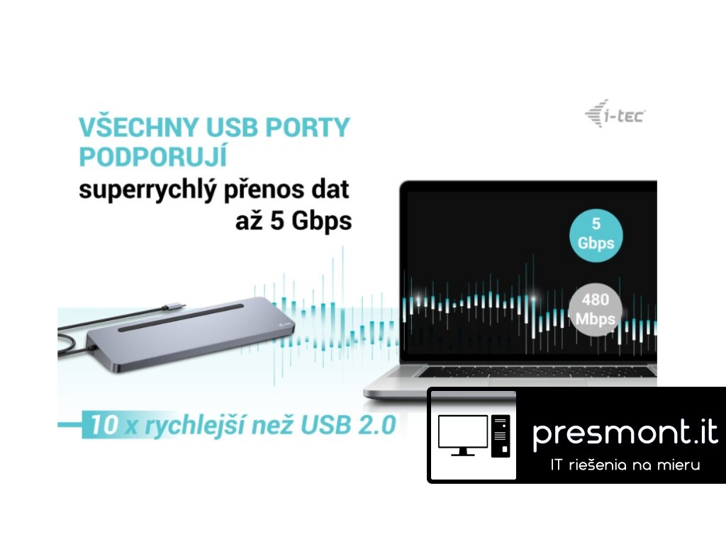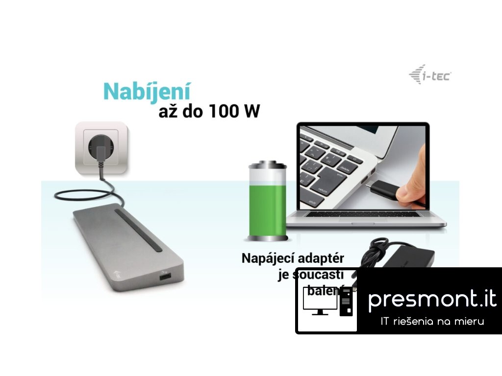 • Dokovací stanice, kterou lze použít i jako stojan pro notebook • Kompatibilní s notebooky a tablety s rozhraním USB-C a Thunderbolt. (Hostitelské zařízení musí podporovat režim DisplayPort Alt). • 2x DisplayPort a 1x HDMI podporují až tři externí displeje 4K nebo jeden displej 5K/60Hz. (Systém macOS podporuje pouze jeden rozšířený displej). • Ergonomický design s hliníkovým krytem, dokovací stanice má integrovaný 60 cm kabel USB-C, takže je vhodná pro použití se všemi notebooky & tablety s displeji do 15'' včetně. • Včetně 4x portů USB 3.2 a slotů na karty SD a microSD usnadňuje připojení více zařízení USB a periferií. • Poskytuje až 100W Power Delivery pro kompatibilní notebooky a tablety s rozhraním USB-C a Thunderbolt. (Hostitelské zařízení musí podporovat USB-C Power Delivery). • GLAN Ethernet podporuje síťové rychlosti 10/100/1000 Mb/s a poskytuje robustní a vysokorychlostní připojení k internetu. • Kombinovaný 3,5mm audio vstup/výstup pro snadné připojení náhlavní soupravy nebo reproduktorů. •• Poznámka: Napájecí zdroj je součástí balení. Pokud chcete použít svou stávající nabíječku USB-C, můžete si dokovací stanici zakoupit samostatně za nižší cenu s číslem dílu (PN) C31FLAT2PDPRO. Ergonomická kovová dokovací stanice USB-C s podporou až 3 externích monitorů. Stanice je kompatibilní s jakýmkoli notebookem vybaveným portem USB-C nebo Thunderbolt (60 cm dlouhý integrovaný kabel je dostatečně dlouhý pro připojení všech notebooků s obrazovkami do velikosti 15”). Dokovací stanice poskytuje 4 porty USB, spolehlivé a rychlé připojení k firemním sítím díky integrovanému portu LAN a napájení až 100 W. Konstrukce stanice umožňuje také její použití jako stojanu pro notebook. Dokovací stanice je k dispozici ve dvou verzích: 1. bez přiloženého nabíjecího adaptéru USB-C (kód produktu C31FLAT2PDPRO) 2. s přiloženým 100W adaptérem (kód produktu C31FLAT2PDPRO100W/UK). • Připojte až tři externí monitory s rozlišením až 4K*. • Napájení: až 100 W • Poskytuje 2x DisplayPort a HDMI • 4x porty USB 3.2 (5 Gb/s) vám umožní snadno připojit vaše zařízení a periferie USB. • Gigabitový Ethernet RJ-45 poskytuje spolehlivé, robustní a vysokorychlostní připojení k internetu s podporou rychlostí 10/100/1000 Mb/s • Kombinovaný konektor pro zvuk a mikrofon (náhlavní soupravu) na předním panelu • Čtečky karet SD a microSD • Kovové tělo Lze použít i jako praktický stojan pro notebook Poznámka: Systém macOS nepodporuje technologii Multi Stream Transport (MST), což znamená, že po připojení k zařízení se systémem macOS budou všechny připojené monitory zobrazovat stejný obraz. Univerzální napájecí adaptér • Tento univerzální napájecí adaptér USB-C s výkonem 100 W je skvělou volbou pro napájení jakéhokoli notebooku nebo jiného zařízení vybaveného konektorem USB-C, který podporuje USB-C Power Delivery s maximální potřebou výkonu 100 W. Specifikace • 1x integrovaný kabel USB-C pro připojení k zařízení (60 cm) • Technologie dokovací stanice: USB-C (MST) • Napájení: 100 W • Interní spotřeba energie: až 15 W (více informací zde) • Video porty: - 1x HDMI - 2x DP Rozlišení: Hostitelské zařízení s podporou DisplayPort 1.2: • 1 monitor – 1x HDMI nebo DP› až 4K/30Hz • 1 monitor – 1x HDMI nebo DP › až 1080p/120Hz • 2 monitory – 1x DP + 1x HDMI › až 2x 1080p/60Hz* • 2 monitory – 2x DP › až 2x 1080p/60Hz* • 3 monitory – 1x HDMI + 1x DP + 1x DP › až 1x 1080p/60Hz + až 2x 720p/60Hz* Hostitelské zařízení s podporou DisplayPort 1.4: • 1 monitor – 1x HDMI › až 4K/60Hz • 1 monitor – 1x DP › až 4K/60Hz • 2 monitory – 1x DP + 1x HDMI › až 2x 1440p/60Hz* • 2 monitory – 1x DP + 1x HDMI › až 2x 4K/30Hz* • 2 monitory – 2x DP › až 2x 4K/30Hz* • 3 monitory – 1x HDMI + 1x DP + 1x DP › až 3x 1080p/60Hz* Hostitelské zařízení s DisplayPortem 1.4 s podporou DSC: • 1 monitor – 1x HDMI › až 4K/60Hz • 1 monitor – 1x DP › až 5K/60Hz • 1 monitor – 1x HDMI › až 1440p/144Hz nebo 1080p/240Hz • 1 monitor – 1x DP › až 4K/144Hz nebo 1440p/240Hz nebo 1080p/360Hz • 2 monitory – 1x DP + 1x HDMI › až 2x 4K/60Hz* • 2 monitory – 1x DP + 1x HDMI nebo DP › až 2x 1440p/144Hz* • 3 monitory – 1x HDMI + 1x DP + 1x DP › až 3x 4K/30Hz* • 1x port USB-C PD (pouze napájení) • 4x port USB-A 3.2 Gen. 1 (5 Gb/s) • 1x port Ethernet GLAN RJ-45 • 1x slot SD / microSD • 1x 3,5 mm kombinovaný audio port • Klonování adres MAC: Ano (pomocí softwaru i-tec Docker Pro) • OPERAČNÍ SYSTÉM: Windows 11, Windows 10, macOS*, iPadOS**, Android**, Chrome OS a Linux s nejnovějšími aktualizacemi. • Rozměry produktu: 270 x 85 x 23 mm • Hmotnost výrobku: 268 g • Rozměry balení: 316 x 130 x 30 mm Hardwarové požadavky: • Zařízení s volným portem USB-C, USB4 nebo Thunderbolt™ 3/4 Požadavky na napájení: • Zařízení s volným portem USB-C, USB4 nebo Thunderbolt™ 3/4 s podporou Power Delivery Požadavky na výstup videa: • Zařízení s volným portem USB-C nebo USB4 s podporou alternativního režimu DisplayPort nebo portem Thunderbolt™ 3/4 Operační systém: • Windows 10 / 11, macOS*, iPadOS**, Android**, Chrome OS a Linux s nejnovějšími aktualizacemi * Systém macOS nepodporuje technologii Multi Stream Transport (MST). Připojení dvou monitorů ke stanici v systému macOS způsobí, že oba monitory budou zobrazovat stejný obraz. ** Systémy iPadOS, Android nepodporují technologii přenosu obrazu na více obrazovek ani možnost rozšířené obrazovky. To znamená, že při připojení k externímu monitoru se zobrazí pouze zrcadlená obrazovka. (Neplatí pro systémy Android s rozšířením DEX a Easy Projection). Univer