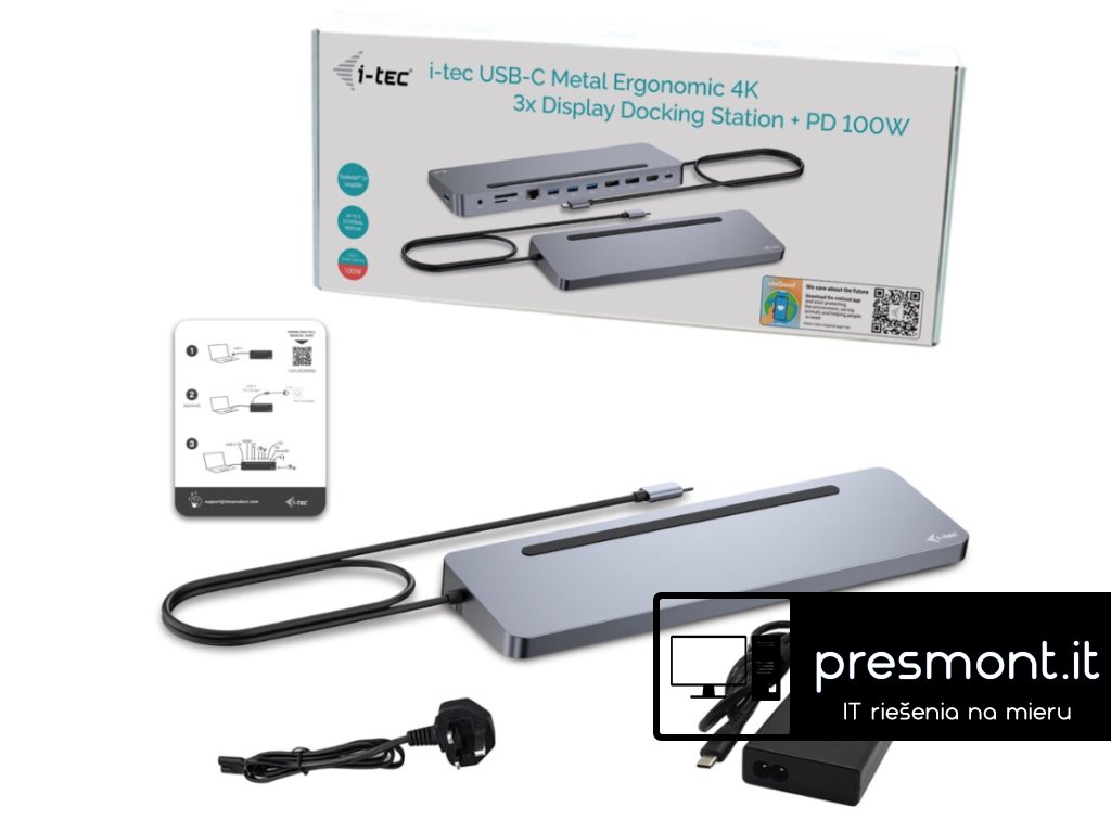 i-tec USB-C Metal Ergonomic 3x 4K Display Docking Station, PD100W + i-tec Universal Charger 100W