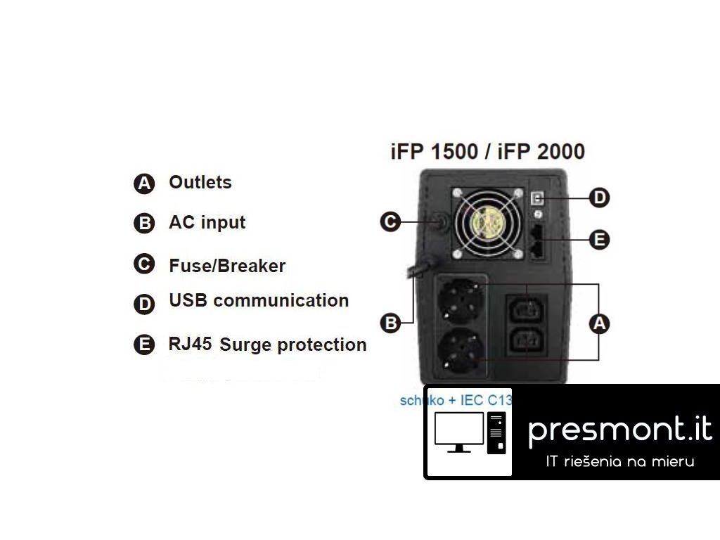 UPS zdroj slouží jako záložní baterie, která udrží počítače, servery a jinou IT techniku v chodu při výpadku elektrického proudu. Hlavní vlastnosti: *Dotykový display LCD *USB komunikační port *Ochrana RJ45 *Řada iFP je vybavena automatickou regulací napětí a tím snižuje dopad nestabilního napětí na zařízení. *Kompaktní velikost *Vynikající mikroprocesorové řízení zaručuje vysokou spolehlivost *Stabilizace napětí *Automatické zapnutí při obnově dodávky elektrické energie *automaticky se nabíjí po obnovení napájení *Dobíjení i ve vypnutém režimu *Funkce studeného startu (bez připojení do elektrické sítě) VÝSTUP Kapacita výstupního výkonu [W]: 1200 Kapacita výstupního výkonu [VA]: 2000 Výstupní napětí [V]: 220 Topologie: Line-interactive Typ křivky: Simulovaná sinusoida Výstupní přípojky: 2x Schuko, 2x IEC C13 VSTUP Vstupní napětí [V]: 220 / 230 / 240 Kmitočet na vstupu [Hz]: 50/60 Rozsah vstupního napětí [VAC]: 140 - 290 BATERIE A DOBA BĚHU Typ baterie: 12V / 9Ah Předinstalované baterie: 2 Obvyklá doba nabíjení [Hod]: 4 - 6 KOMUNIKACE A SPRÁVA Port rozhraní: USB Indikátory: LCD displej Zvukové upozornění: Ano FYZICKÉ Maximální výška [cm]: 18 Maximální šířka [cm]: 13 Maximální hloubka [cm]: 32 Čistá hmotnost [kg]: 11 Barva: Černá Provozní teplota [°C]: 0 - 40 Hlučnost [dB]: méně než 40 Obsah balení: Jednotka UPS včetně instalované baterie, Uživatelská příručka UPS selector: https://energy.fsp-europe.com/ -> Tools -> UPS Selector Odkaz na stránky výrobce: https://energy.fsp-europe.com/product/ifp-2000/ Odkaz pro stažení softwaru ViewPower: https://www.power-software-download.com/viewpower.html Video k Software ViewPower: https://www.youtube.com/watch?v=r3P4zmNBzjcDodatočné parametre
