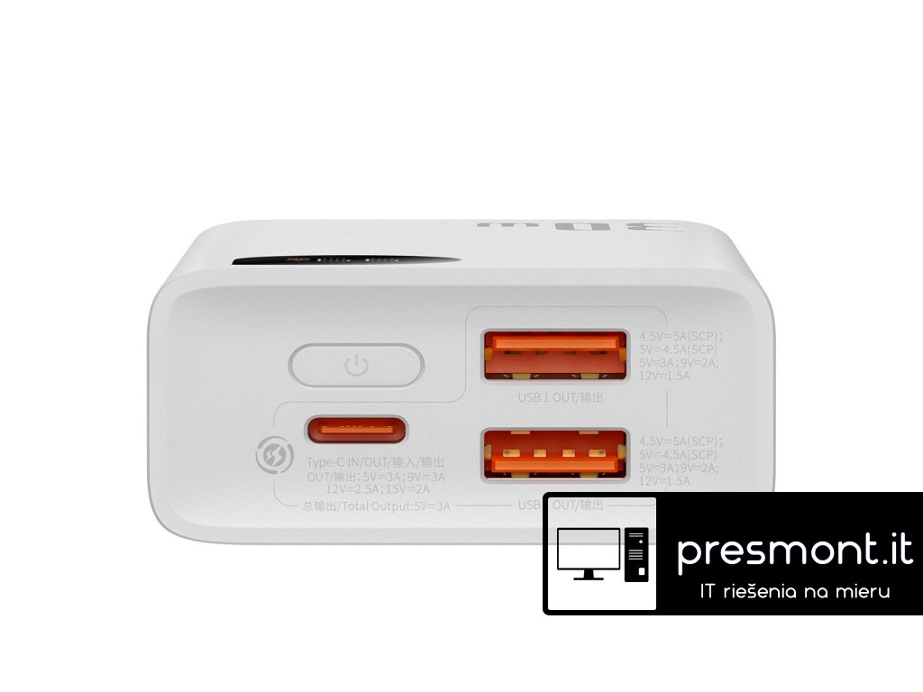 Baseus Adaman2 powerbanka s digitálním displejem 10000mAh 30W Vlastnosti * výstupní výkon 30W * současné nabíjení až 3 zařízení * LED displej indikuje úroveň nabití baterie * rychlé nabíjení: PD (Power Delivery), SCP (Huawei Super Charge Protocol), FCP (Huawei Fast Charge Protocol), QC (Qualcomm Quick Charge), AFC (Samsung Adaptive Fast Charging) Technické parametry Typ baterie: lithium-polymer Kapacita baterie: 10000mAh/37Wh Celkový výstupní proud: 5V/3A Barva: bílá Rozměry: 111,2x54x26,5mm Hmotnost: 206g Porty: * 2x USB-A: 4,5V/5A, 5V/4,5A, 5V/3A, 9V/2A, 12V/1,5A (výstup) * 1x USB-C: 5V/3A, 9V/2A, 12V/1,5A (vstup), 5V/3A, 9V/3A, 12V/2,5A, 15V/2A (výstup) Záruka: 2 rokyDodatočné parametre