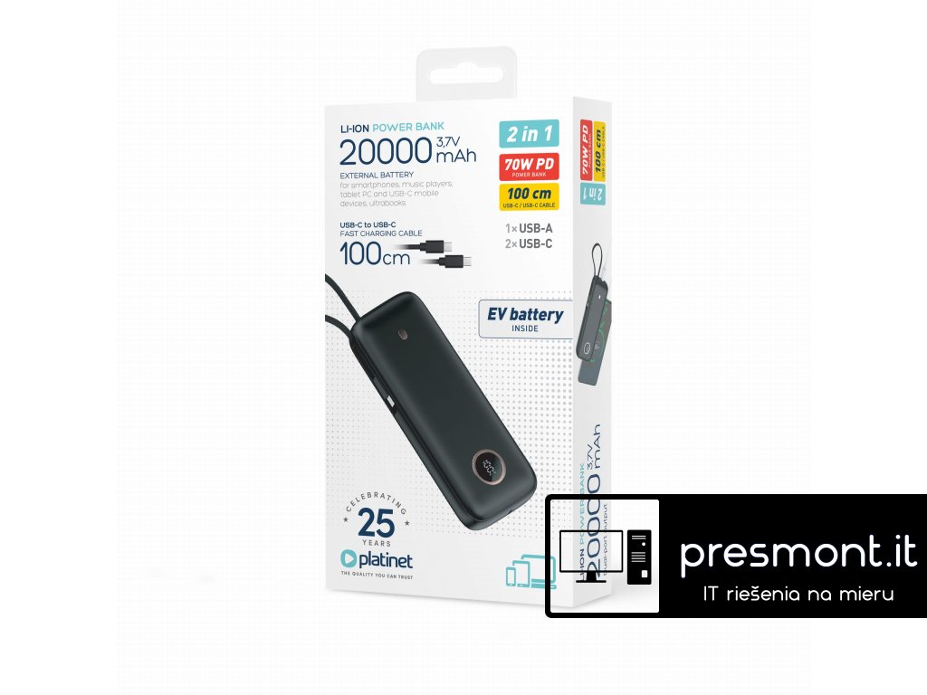 Platinet Powerbanka 20000 mAh 70W Power Delivery, 1xUSB-C, 1xUSB-A, kábel USB-C 1m, čierna