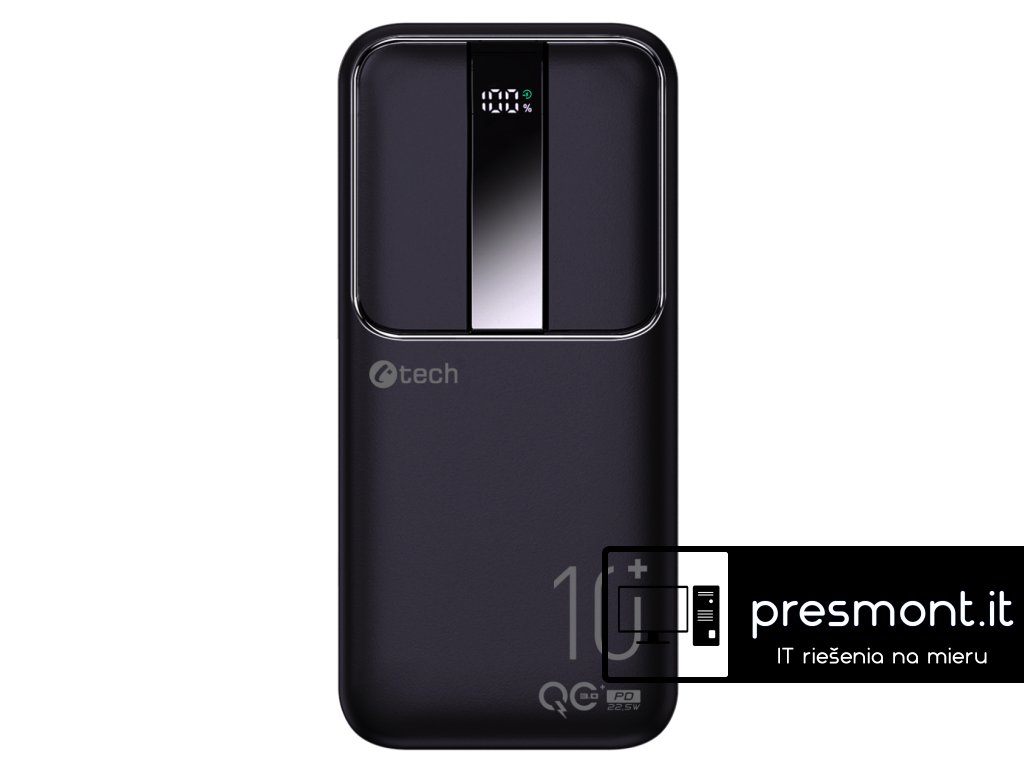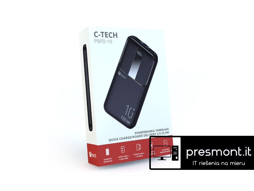 Powerbanka C-tech 10000mAh, Li-Pol, 22,5 W, USB-C/USB-A/micro USB