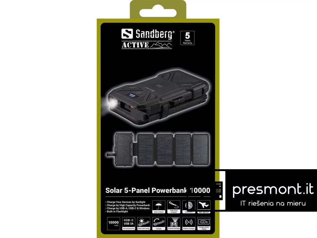 Sandberg Solar 5-Panel Powerbank 10000 Solar 5-Panel Powerbank 10000 je kombinací výkonné powerbanky s kapacitou 10000 mAh a skládacího solárního panelu, která vám umožní rychle a efektivně dobít powerbanku na slunci. Nabijte powerbanku doma a kdykoli můžete, rozložte ji na slunci. Tímto způsobem budete mít vždy energii pro mobilní zařízení, bez ohledu na to, jak daleko jste od zásuvky. Specifikace: Kapacita baterie: 10 ,000 mAh Watthodinová hodnota (Wh): ,37 Porty: , Input: , *USB-C ,5V/3A, 9V/2A, 12V/1.5A (PD18W max) Output: , *USB-C (solo): 5V/3A, 9V/2.2A, 12V/1.67A (PD20W max) *USB-A ,(solo): 4.5V/5A, 5V/4.5A, 9V/2A, 12V/1.5A (22.5W max) Bezdrátové nabíjení: Ano (15W max.) Magnetická podložka: Ano Svítilna: Ano Displej: Ano Možnosti: ,schváleno pro příruční zavazadla, skládací, vodě odolné, venkovní Barva: ,Černá Rozměry(V x Š x H): 17,2 x 9,8 x 4,1 Hmotnost: 550 g , Obsah balení: , *1x Powerbanka *1x kabel USB-C/USB-C (30 cm) *Závěsná šňůrka *Uživatelská příručka Záruka: ,5 LetDodatočné parametre