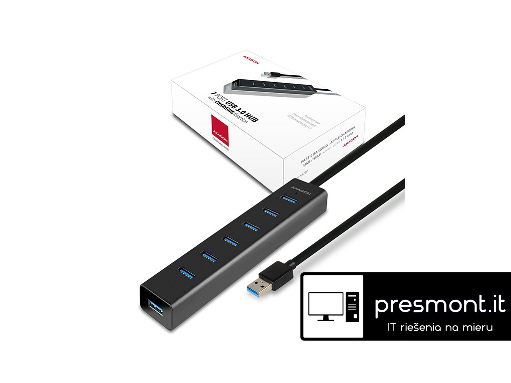 7-portový USB 3.0 hub AXAGON HUE-SA7BP ALU CHARGING s vlastním napájením a podporou rychlonabíjení na všech USB portech. Kompaktní rozbočovač s odolným hliníkovým pláštěm připojí k počítači až sedm USB zařízení současně. Napevno uchycený USB kabel dostatečné délky 40 cm ideální pro použití s notebooky. Zároveň lze nabíjet mobilní telefony/tablety/powerbanky a další zařízení proudem až 2 A v kterémkoliv portu hubu díky podpoře USB Battery Charging 1.2. Funguje i jako samostatný charging hub a nabíjí USB zařízení z napájecího adaptéru i po vypnutí nebo odpojení počítače. Kompaktní napájecí adaptér 5V/2A součástí balení. Zvládne trvalé připojení několika externích disků i bez vlastního napájení hubu. S vlastním napájením spolehlivě připojí až čtyři 2.5'' magnetické externí disky. Napříč umístěné USB porty s dostatečným rozestupem pro přímé bezproblémové připojení rozměrných USB zařízení. Vlastnosti: • 7 downstream USB 3.0 portů s dostatečným prostorem kolem konektorů. • upstream USB 3.0 port s konektorem USB 3.0 type-A male na napevno uchyceném 40cm dlouhém kabelu. • Kompatibilní s USB 3.0, zpětně kompatibilní s USB 2.0 a USB 1.1. • Podpora přenosových rychlostí 1.5 / 12 / 480 / 5000 Mbit/s (low / full / high / super speed). • Podpora USB Battery Charging v 1.2 specifikace. • Každý port hubu lze použít pro nabíjení proudem až 2 A. • Možnost připojení zařízení za chodu díky podpoře Hot Plug. • Plná podpora Plug and Play. • LED indikace připojení hubu k napájení. • Detekce a ochrana proti proudovému přetížení. • Rozměry hubu 156 x 30 x 21 mm, rozměry AC adaptéru 29 x 75 x 80 mm včetně vidlice. • Hmotnost hubu 88 g (vč. kabelu), hmotnost AC adaptéru 100 g (vč. kabelu). Režim napájení hubu přes USB kabel (bus power): • Napájení po USB sběrnici je dostatečné pro připojení USB zařízení s nízkým odběrem (myš, klávesnice, čtečka karet, flash disk apod.) nebo vlastním napájením (tiskárna, skener, 3.5'' externí disk) do všech sedmi portů. • USB hub v tomto režimu napájení také utáhne až 2 magnetické 2.5'' externí disky, při postupném připojování i tři disky současně. • Nabíjení mobilních zařízení (kromě iPad) je i v tomto režimu napájení možné, nabíjecí proud však dosahuje jen max. 0.9 A. Režim vlastního napájení hubu z přibaleného napájecího adapteru (self power): • Vlastní napájení přes přibalený AC/DC adaptér (vstup: 100-240V~, 50/60Hz, 0.45A, výstup: 5V-2A / 10W, dvoukolíková euro vidlice, výstupní souosý konektor průměru 3.5/1.3 mm, kabel 150cm. • USB hub v tomto režimu napájení zvládne 4 magnetické 2.5'' externí disky. Pro spolehlivý dlouhodobý provoz hubu však doporučujeme připojení max. 3 magnetických externích 2.5'' disků současně. • Rychlonabíjení mobilních zařízení (včetně iPad) proudem až 2 A v každém z portů hubu. Celkový proud dodávaný hubem při nabíjení je omezen výstupním proudem napájecího adapteru na max. 2 A. Režim samostatného nabíjecího hubu bez připojení k počítači (charging hub): • Po vypnutí připojeného počítače nebo bez připojení k počítači hub funguje s napájením přes přibalený AC/DC adaptér jako samostatný nabíjecí USB hub. • Rychlonabíjení mobilních zařízení (včetně iPad) proudem až 2 A v každém z portů hubu. Celkový proud dodávaný hubem při nabíjení je omezen výstupním proudem napájecího adapteru na max. 2 A. Podporované operační systémy: MS Windows XP / Vista / 7 / 8 / 8.1 / 10 a novější, Windows Server 2003 / 2008 / 2012 / 2016 a novější (podporovány všechny 32- i 64-bitové verze OS Windows), Mac OS X 10.4.x a vyšší, Linux s jádrem 2.6.x a vyšším. Pozn.: Ovladače jsou součástí podporovaných operačních systémů a nainstalují se zcela automaticky. Žádné jiné ovladače není třeba instalovat a nejsou ani k dispozici. Balení v kartónové krabičce s přehledně uvedenými parametry a postupem instalace obsahuje: • USB 3.0 rozbočovač s kabelem napevno délky 40 cm, • napájecí adapter.Dodatočné parametre