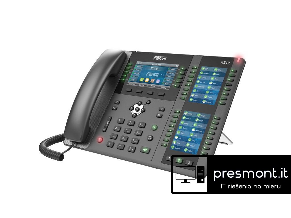 Fanvil X210 je špičkový podnikový IP telefon pro uživatele, kteří potřebují získat přístup k flexibilním a pokročilým funkcím, aby zvládli střední až vysoké objemy hovorů při své každodenní práci. Má 10 DSS tlačítek u 4,3'' hlavním barevném displeji a až 96 DSS tlačítek (32 fyzických) u dvou 3,5'' bočních barevných displejů. X210 má tedy celkem až 106 DSS tlačítek. Podporuje také HD zvuk, vestavěný Bluetooth, Wi-Fi konektivitou, EHS, dva Gigabit porty, PoE, integrací s IP kamerami a SIP dveřními telefony, což přináší obrovskou produktivitu díky těmto pokročilým funkcím. Díky elegantnímu designu a velkému 4,3'' barevnému displeji s vysokým rozlišením a dvěma praktickým 3,5'' bočním barevnými displeji je používání tohoto IP telefonu intuitivnější než kdy dříve. Nově přidaná podpora pro Opus a větší audio dutina přinášejí bohaté basy a silný zvukový efekt. Hlasitý odposlech poskytuje křišťálově čistou hlasovou komunikaci jako při osobním setkání. Díky jedinečnému dizajnu a pohodlnému ovládání X210 s dvěma bočními displeji a s DSS tlačítky , není třeba přidávat externí rozšiřující moduly. Se třemi tlačítky pro přepínání stránek umožňují boční displeje nastavit až 96 DSS tlačítek (32 fyzických) a plus 10 DSS tlačítek na hlavním displeji je celkem k dispozici až 106 DSS pro nastavení BLF, rychlé volby, broadcasting atd. Bohaté rozšiřující funkce X210 nabízí řadu možností připojení zařízení včetně Wi-Fi (přes Wi-Fi dongle), integrovaného Bluetooth, EHS náhlavních souprav, USB portu pro nabíjení smartphonu nebo jiných zařízení. Dva gigabitové porty vám umožní připojit váš stolní počítač nebo notebook k telefonu bez nutnosti další kabeláže. X210 je vybavený videokodekem H.264, umožňuje integraci s vaší IP kamerou nebo Fanvil SIP video dveřním telefonem, takže můžete oboustranně mluvit s návštěvníky a odemknout dveře z vašeho IP telefonu X210. Hlavní funkcí: - 20 SIP linek, 3-cestná konference, hotspot - HD zvuk na hlasitém telefonu a sluchátku - 4,3'' hlavní barevný displej - Vestavěné Bluetooth - Dva 3,5'' boční barevné displeje pro tlačítka DSS - Až 106 kláves DSS (42 tříbarevných fyzických kláves) - Dva gigabitové porty, integrované PoE - Wi-Fi připojení (přes Wi-Fi dongle) - Podpora EHS náhlavní soupravy - Video kodek H.264 podpora příjmu videohovorů - Stojan se 2 nastavitelnými úhly 40 a 50 stupňů - Kompatibilní s hlavními platformami: 3CX, Asterisk, Broadsoft, Metaswitch, Avaya atd.Dodatočné parametre