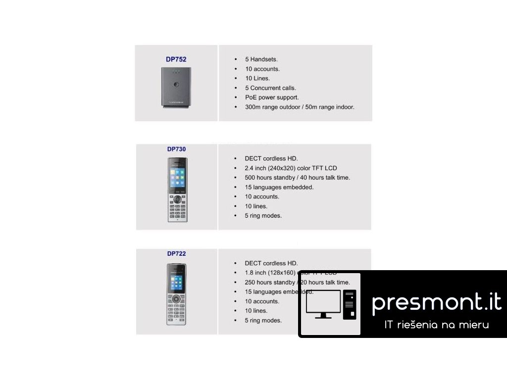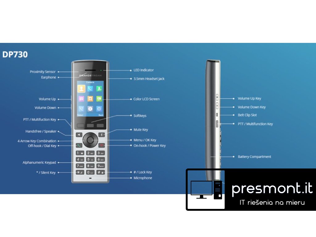 Grandstream DP730 je bezdrátová DECT ručka, která v kombinaci s DECT základnou stejného výrobce, byla navržena pro každodenní užívání ve firemním segmentu, především ve skladových, maloobchodních prostorách, dohledových centrech, zdravotnických zařízeních, či sdílených kancelářích. Své místo si může najít i u náročných uživatelů v domácnosti. Lze ji spárovat se základnovou bází DP750, nebo DP752. Kromě volání v rámci VoIP sítě, nabízí možnost využití funkce push-to-talk, která je především známá u vysílaček. Tlačítko pro tuto funkci najdete na boční straně ručky. Další z nadstandardních funkcí ručky je možnost zobrazení videa na 2.4'' TFT LCD barevném displeji. 100% kompatibilitu zaručí použití video vrátníku GDS3710. Dané video můžete, díky názorné navigaci pomoci klávesnice ručky, dokonce zoomovat. Samozřejmostí je zvuk v HD kvalitě a možnost hlasitého poslechu z reproduktoru ručky. Model DP730 nabízí i funkci HAC (hearing aid compatibility), v rámci které zvuk putuje přímo do naslouchátka uživatele. Důležitým benefitem je výdrž baterie, díky které můžete uskutečnit hovor v délce až 40 hodin. Délka pohotovostního režimu je až 500 hodin. Ručku lze dobíjet prostřednictvím nabíjecí kolébky, nebo pomocí nabíječky s Mikro-USB portem. Obojí je součástí balení. Zařízení kromě mnoho telefonních funkcí podporuje řadu různých jazyků. Samozřejmostí je také čeština a slovenština. - barevný 2.4'' TFT LCD displej s podporou steamování videa - až 10 linek per ručka DP730 - 3cestná konference - podpora HAC, kdy putuje zvuk do naslouchátka uživatele - 3,5mm jack pro připojení náhlavky - tlačítko Push-to-talk, vestavěné senzory akcelerometru - podpora funkce intercom - funkce zero configuration, kterou je možno použít s ústřednami Grandstream řady UCM - nabíjení prostřednictvím Mikro USB portu Obsah balení: - ručka DP730 - univerzální napájecí zdroj s Micro USB portem - nabíjecí kolébka - spona na opasek - uživatelská příručkaDodatočné parametre