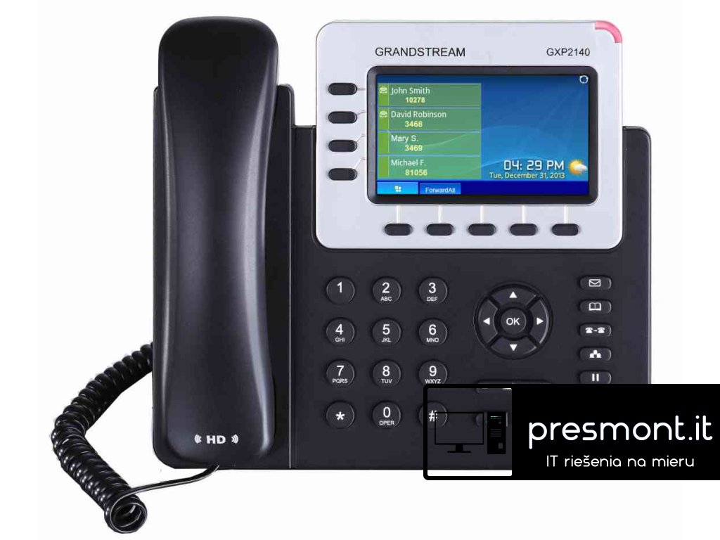 Reprezentativní přitom výkonný podnikový IP telefon: GXP2140 Téměř každá společnost či instituce, která disponuje velkým rozsahem telefonních čísel, se dnes neobejde bez přístroje, z kterého lze jejich provoz snadno, rychle a efektivně řídit. Velkým pomocníkem je určitě telefonní ústředna, která umí podstatnou část ať už příchozích, nebo odchozích hovorů, sama směrovat a automaticky řídit. Pořád se ale setkáváme se situacemi, kdy je vyžadována práce lidského faktoru, který je prostě stále v některých ohledech nepostradatelný. V takovém případě jistě oceníte kvalitního pomocníka, jakým model GXP2140 bezesporu je. Tento model najde nejčastěji využití na recepcích, vrátnicích, či jiných uvítacích halách, kde je kladen důraz na reprezentativní vzhled. Věříme, že GXP2140 svým moderním designem neurazí žádného uživatele. Právě naopak, a také že si ho navíc získá díky intuitivnímu menu, které se snadno ovládá na přehledném barevném 4.3“ TFT LCD displeji. Uživatelsky přívětivá je i možnost zvolení si vlastní vyzváněcí melodie. Při velkém rozsahu telefonních čísel se rovněž neobejdete bez adresáře. Telefon umí pracovat se vzdáleným centrálním telefonním seznamem, a to například ve formátech XML, nebo LDAP. V takovém případě je schopný pojmout až 2000 kontaktů a ukázat až 500 záznamů z historie volání. Export a import dat lze provést i pomocí USB slotu. V kombinaci s expanzním modulem GXP2200EXT získáte možnost využití BLF tlačítek s dvojbarevnou indikací stavu linek. Celkem můžete na jeden přístroj GXP2140 připojit až 4 moduly. Vzhledem k tomu, že jeden modul nabízí až 40 BLF tlačítek, dostanete se na maximální kapacitu úctyhodných 160 BLF tlačítek. Telefon samozřejmě podporuje i jiné funkce, na které jsou dnešní nároční uživatelé zvyklí. Patří mezi ně třeba Bluetooth, díky kterému lze využít komfortu bezdrátové náhlavní soupravy. Mezi ty techničtější pak patří duální 1Gb/s ethernetové porty, nebo funkce Qos, která upřednostňuje hlasové pakety před běžným datovým tokem, čímž zajišťuje vždy perfektní výsledek v rámci kvality zvuku hovoru. Všechny telefony Grandstream nabízí nejmodernější technologie šifrování zabezpečení (SRTP a TLS). Kombinace tohoto telefonu se zařízením IP PBX řady UCM společnosti Grandstream umožňuje využití funkce Zero-Config, která podporuje automatizované poskytování služeb pomocí konfiguračního souboru TR-069 nebo AES šifrovaného XML. Model lze konfigurovat se všemi dalšími významnými IP PBX systémy, například 3CX, Broadsoft, Asterisk...Dodatočné parametre