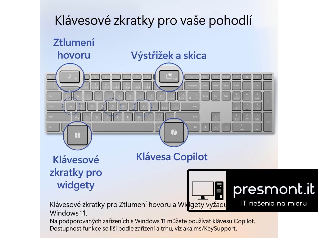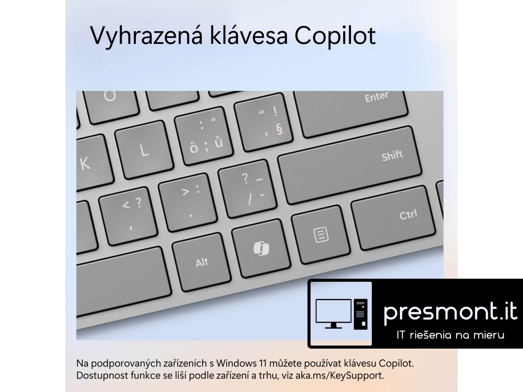 klávesnice Microsoft Surface Keyboard (2. edice) Díky klávese Copilota u klávesnice pro Surface máte ve Windows 11 výhody umělé inteligence na dosah ruky. Tahle elegantní klávesnice umožňuje klasické psaní se zabudovanou numerickou částí a vyhrazenými klávesami pro rychlý přístup k funkcím výstřižky a skica, expresivní vstup, ztlumení hovoru a dalším. Rozměry: 420,9 × 112,6 × 19,3 mm Hmotnost: 419,3 g (s bateriemi) Rozhraní: Bluetooth Low Energy 4.0 Dosah: 10 m ve volném prostoru, až 5 m v typickém kancelářském prostředí Napájení: 2× AAA (součást balení) Výdrž baterií: až 1 rok Barva: šedá Klávesy: * QWERTZ (CZ&SK) * multimediální klávesy: základní (zvýšení/snížení hlasitosti, ztlumení, přehrávání/pozastavení, převinutí zpět/vpřed) * klávesa Copilot pro Windows, Expresivní vstup, Výstřižky/Snímek obrazovky, Ztlumení hovoru a Widgety * funkce šifrování: AES přes Bluetooth LE SSP nebo klíč Kompatibilita: Windows, Android, mac OS X, iOS Odkaz na stránky výrobce a informace o produktu: https://www.microsoft.com/cs-cz/d/klavesnice-surface-keyboard-2-edice/93d9l5tctr0bDodatočné parametre