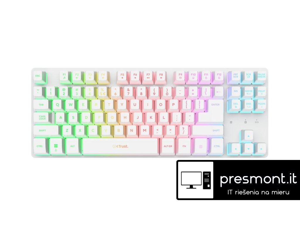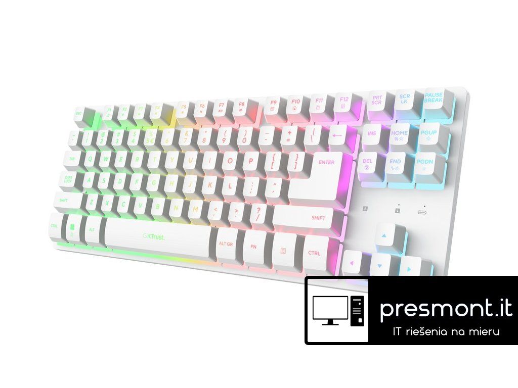 TRUST GXT831 Thado TKL Wireless Gaming Keyboard Bílá Bezdrátová podsvícená herní klávesnice TKL s nízkou latencí Specifikace: Konektivita: Wireless Typ konektoru: USB-A 2.0 Podsvícená: Ano Počet kláves: 87 FN Klávesa: Ano Indikátory: Prázdná baterie, Caps-lock, Scroll-lock Rozměry (ŠxHxV): 360 x 137 x 41mm Hmotnost: 710g Obsah balení: *Wireless gaming keyboard *Storable USB-A receiver *Charge cable *User guide Záruka: ,2 rokyDodatočné parametre