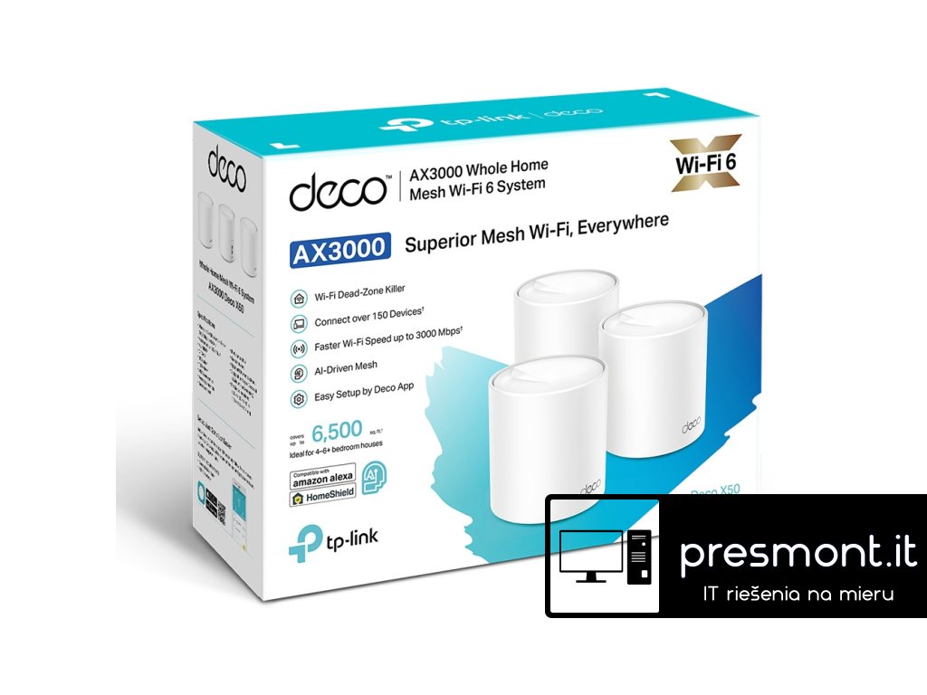 WIRELESS Standards: *Wi-Fi 6 *IEEE 802.11ax/ac/n/a 5 GHz *IEEE 802.11ax/n/b/g 2.4 GHz WiFi Speeds: AX3000 5 GHz: 2402 Mbps (802.11ax, HE160) 2.4 GHz: 574 Mbps (802.11ax) WiFi Range: 4-6+ Bedroom Houses (3-pack) TP-Link Mesh Technology Optional Ethernet backhaul work together to link Deco units to provide seamless coverage AI-Driven Mesh Intelligently learns the network environment to provide ideal Wi-Fi unique to your home 2× Antennas (Internal) Multiple antennas form a signal-boosting array to cover more directions and large areas Beamforming Concentrates wireless signal strength towards clients to expand WiFi range WiFi Capacity: High Dual-Band Distribute devices to different bands for optimal performance 2×2 MU-MIMO Simultaneously communicates with multiple MU-MIMO clients OFDMA Simultaneously communicates with multiple WiFi 6 clients 4 Streams More than enough bandwidth for connected devices Working Modes: *Router Mode *Access Point Mode HARDWARE Processor:1 GHz Dual-Core CPU Button Reset Button Ethernet Ports *3× Gigabit Ports *Per Deco Unit *Supports WAN/LAN auto-sensing Power: 12V ?1.5A SECURITY WiFi Encryption: *WPA-Personal *WPA2-Personal *WPA3-Personal Network Security: SPI Firewall Access Control HomeShield Security Real-Time IoT Protection Malicious Site Blocker Intrusion Prevention System DDoS Attack Prevention Home Network Scanner Guest Network: 1× 5 GHz Guest Network 1× 2.4 GHz Guest Network SOFTWARE Protocols: IPv4 IPv6 Service Kits:HomeShield Parental Controls: HomeShield Parental Controls Custom Profiles Professional Content Filter Library Family Time Bedtime Off Time Time Rewards Family Online Time Ranking Pause the Internet Weekly and Monthly Reports WAN Types: Dynamic IP Static IP PPPoE PPTP L2TP Quality of Service: HomeShield QoS QoS by Device Cloud Service: OTA Firmware Upgrade TP-Link ID DDNS NAT Forwarding: Port Forwarding UPnP IPTV: IGMP Proxy IGMP Snooping Bridge Tag VLAN DHCP: Address Reservation DHCP Client List Server DDNS: TP-Link Management: Deco App PHYSICAL Dimensions (W×D×H): 4.33 × 4.33 × 4.49 in (110 × 110 × 114 mm) Package Contents: Deco X50 (1-pack) 1 Deco X50 unit 1 RJ45 Ethernet cable 1 Power adapter 1 Quick Installation Guide Deco X50 (2-pack) 2 Deco X50 units 1 RJ45 Ethernet cable 2 Power adapters 1 Quick Installation Guide Deco X50 (3-pack) 3 Deco X50 units 1 RJ45 Ethernet cable 3 Power adapters 1 Quick Installation Guide OTHERS System Requirements: Android 4.4 or later, iOS 9.0 or later Certifications: CE, FCC, RoHS, RCM Environment Operating Temperature: 0°C~40°C (32°F~104°F) Storage Temperature: -40°C~70°C (-40°F~158°F) Operating Humidity: 10%~90% non-condensing Storage Humidity: 5%~90% non-condensingDodatočné parametre