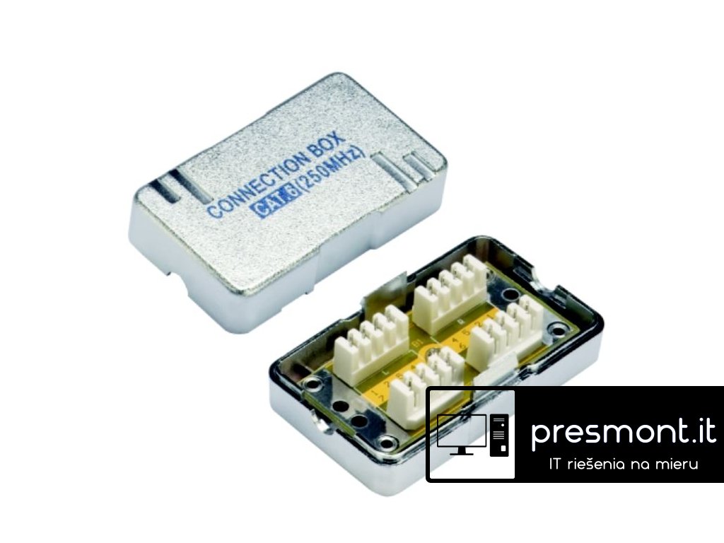 Spojovací BOX STP CAT.6 (2* zářez. pole), stříbrný Stíněná spojka CAT.6 pro spojení dvou kabelů pomocí zářezového pole. Koncovky: Zářezové pole LSA - Zářezové pole LSA Zapojení pinů: 1-1 2-2 3-3 4-4 5-5 6-6 7-7 8-8 S-S Rozměry: (V) 26 mm x (D) 69 mm x (Š) 41 mmDodatočné parametre