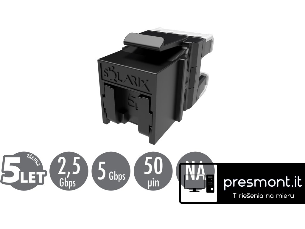 Keystony produktové řady Solarix – kategorie 5E s označením SXKJ-5E-UTP-BK-NA jsou keystony, u kterých je důraz kladen především na rychlost a jednoduchost zařezání. Tyto keystony lze zařezat speciálními kleštěmi, které významně zkracují čas instalace. Keystony jsou dostupné ve stíněném i nestíněném provedení a bez problémů splňují požadavky definované v mezinárodních standardech ANSI/TIA 568, ISO/IEC 11801 a EN 50173 pro kategorii 5E a třídu vedení Class D, včetně všech nejnovějších dodatků. Standardní barva nestíněných keystonů je černá, u stíněné verze je tělo modulu opatřeno stříbrnou kovovou částí. Kleště s označením SXKJ-NA-BU je nutné dokoupit zvlášť a lze je použít pouze na tento typ keystonů (tj. SXKJ-xx-yyy-BK-NA). Stejně jako všechny komponenty v produktové skupině Solarix – kategorie 5E jsou i tyto rychlozařezávací keystony vyrobeny tak, aby poskytovaly maximální životnost, vynikající výkon, spolehlivost a především jednoduchou instalaci. Nestíněné keystony jsou navíc vybaveny speciální protiprachovou krytkou. Díky svým kompaktním rozměrům jsou tyto rychlozařezávací keystony kompatibilní s modulárními zásuvkami většiny výrobců (např. ABB, Schneider, Legrand, Moeller, Hager, Obzor atd.). Tuto kompatibilitu si můžete ověřit v naší tabulce kompatibility keystonů Solarix. Technické parametry Kategorie: CAT5E Podporované protokoly: 2.5G/5GBASE-T a nižší Stínění: ne Min. životnost portu: 1 000 zapojení/odpojení Krytí kontaktů: 50 µ zlata a 100 µ niklu Svorkovnice: rychlozařezávací Velikost a typ vodiče: AWG 26 - 22, drát Materiál nekovových částí: FR plast podle UL94-0 Barva: černá Skladovací teplota: -40 až 70 °C Provozní teplota: -10 až 60 °C Max. provozní vlhkost: 93 % Balení: 1 ks, plastový sáček Rozměry balení (výška x šířka x hloubka): 145 mm x 90 mm x 20 mm Přepravní balení: 400 ks, kartónový box Rozměry přepravního balení (výška x šířka x hloubka): 230 mm x 515 mm x 400 mmDodatočné parametre