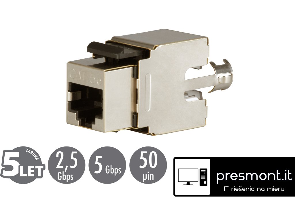 Zařezávací keystony produktové řady Solarix – kategorie 5E jsou dodávány jak v nestíněném, tak i ve stíněném provedení. Standardní barva u nestíněného keystonu je černá, v případě stíněného keystonu je tělo modulu opatřeno stříbrnou kovovou částí. Oba tyto typy keystonů převyšují požadavky definované ve standardech ANSI/TIA 568, ISO/IEC 11801 a EN 50173 pro kategorii 5E a třídu vedení Class D, včetně všech nejnovějších dodatků. Zařezávací keystony Solarix nabízí vysokou spolehlivost, maximální funkčnost a jednoduchou instalaci. Kontakty duální svorkovnice typu 110/Krone jsou označeny barevným schématem podle způsobu zapojení, a to buď podle standardu T568A, nebo T568B. Do svorkovnice lze zařezat kabely typu drát s vodiči o velikosti AWG 26 – 22. Pro pohodlné a bezpečné zařezávání keystonů je k dispozici montážní držák SXKJ-MD-BU určený k zafixování keystonu na pracovní ploše (tj. při zařezávání není nutné držet keystone přímo v ruce). Díky svým kompaktním rozměrům jsou tyto zařezávací keystony kompatibilní s modulárními zásuvkami většiny výrobců (např. ABB, Schneider, Legrand, Moeller, Hager, Obzor atd.). Tuto kompatibilitu si můžete ověřit v tabulce kompatibility, která se nachází v záložce ''Odkazy''. Technické parametry Kategorie: CAT5E Podporované protokoly: 2.5G/5GBASE-T a nižší Stínění: ano Min. životnost portu: 1 000 zapojení/odpojení Krytí kontaktů: 50 µ zlata a 100 µ niklu Svorkovnice: duální 110/Krone 8p8c Min. životnost svorkovnice: 200 zařezání Velikost a typ vodiče: AWG 26 - 22, drát Materiál nekovových částí: FR plast podle UL94-0 Barva: černá (vnitřní část), stříbrná (kovové tělo) Skladovací teplota: -40 až 70 °C Provozní teplota: -10 až 60 °C Max. provozní vlhkost: 93 % Balení: 1 ks, plastový sáček Rozměry balení (výška x šířka x hloubka): 145 mm x 90 mm x 20 mm Přepravní balení: 300 ks, kartónový boxDodatočné parametre