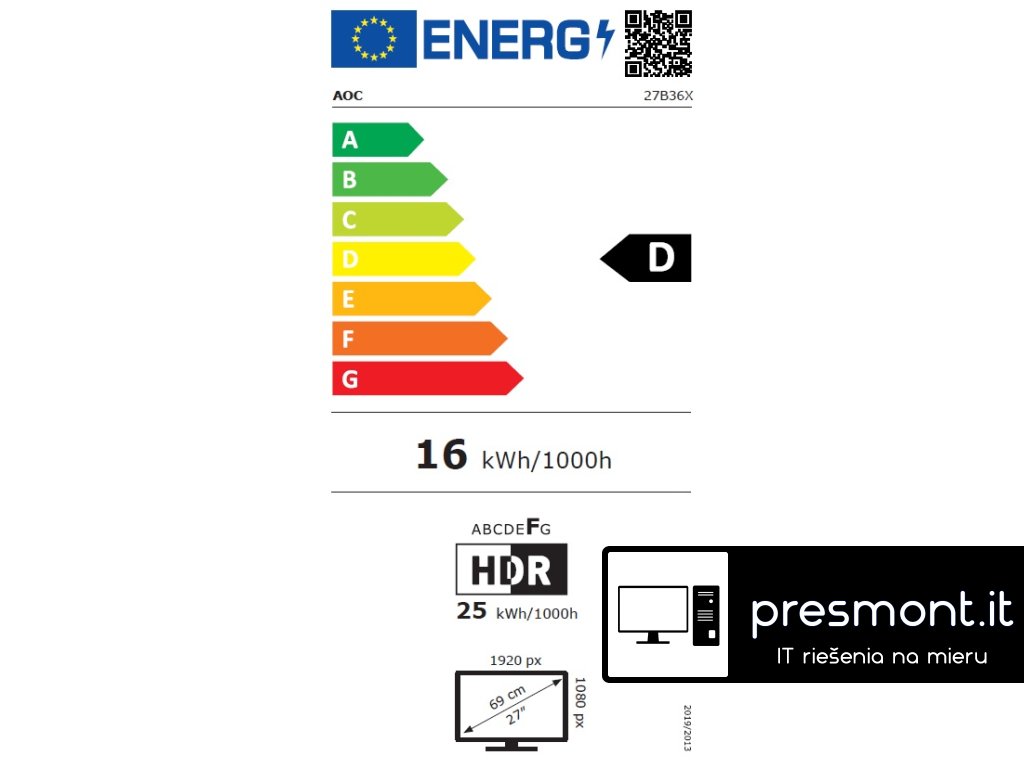 AOC 27B36X Typ obrazovky: ,IPS ,  , Podsvícení: ,WLED Úhlopříčka [palce]: ,27 Rozlišení: ,1920 x 1080 Rozteč bodu [mm]: ,0.3114 Obnovovací frekvence [Hz]: ,144 Poměr stran: ,16:9 Povrch displeje: ,Antireflexní Jas [cd/m2]: ,300 Kontrast: ,1500:1 Odezva [ms]: ,0.5 Pozorovací úhly (Horizontál/Vertikál): ,178/178 Počet barev: ,16.7 mil. Konektory: , *1x HDMI 1.4 *1x HDCP 1.4 *1x DisplayPort 1.4 *Výstup pro sluchátka (3,5 mm) Napájení: ,Externí Spotřeba [W]: ,22 Stand By režim [W]: ,0.3 Třída energetické náročnosti: ,D Montáž na zeď: ,VESA 100 x 100 Naklápění monitoru: ,-5 (+3/-0) ~ +23 (-3/+0) Barva: ,Černá Rozměry (se stojanem, ŠxVxH mm): ,616 x 447.4 x 205.6 Rozměry (bez stojanu, ŠxVxH mm): ,616.0 x 358.8 x 36.2 Hmotnost [kg]: ,3.11 Obsah balení: , *HDMI kabel *Napájecí kabel Záruka: ,3 Roky Stránky výrobce: ,https://aoc.com/cz/products/monitors/27b36xDodatočné parametre