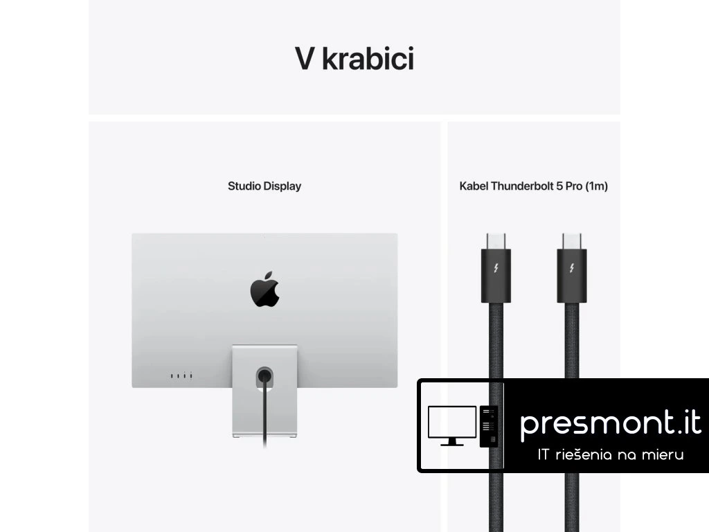 Působivý 27palcový Retina 5K displej s kamerou, reproduktory a Thunderboltem 5. Ideální parťák k Macu. *Široký barevný rozsah (P3) *Technologie True Tone Typ obrazovky: ,Retina 5K displej Úhlopříčka [palce]: ,27'' Rozlišení: ,5120 x 2880 při 218 pixelech na palec Obnovovací frekvence [Hz]: ,60Hz Poměr stran: ,16:9 Povrch displeje: Matný Jas [cd/m2]: ,600 nitů Kontrast: ,100 000:1 Pozorovací úhly (Horizontál/Vertikál): ,178°/178° Počet barev: ,1 miliarda barev Reproduktory: ,Ano Konektory: , *1x upstream port Thunderbolt 5 (•) na připojení k hostiteli (s napájením hostitele příkonem 96 W) *1x downstream port Thunderbolt 5 na připojení vysokorychlostních doplňků nebo sériové připojení dalších displejů *2x USB-C (až 10Gb/s) porty na připojení periferních zařízení, úložišť a sítě Napájení: ,96 W Třída energetické náročnosti: ,F Naklápění monitoru: , -5°až +25° Referenční režimy: , *Apple Display (P3-600 nitů) *HDTV video (BT.709-BT.1886) *NTSC video (BT.601 SMPTE-C) *PAL a SECAM video (BT.601 EBU) *Digitální kino (P3-DCI) *Digitální kino (P3-D65) *Návrh a tisk (P3-D50) *Fotografie (P3-D65) *Internet a web (sRGB) Barva: ,Stříbrná Rozměry (se stojanem, ŠxVxH mm): ,623x478x168mm Hmotnost [kg]: ,6,3kg Obsah balení: , *Studio Display *Kabel Thunderbolt 5 Pro (1m)Dodatočné parametre