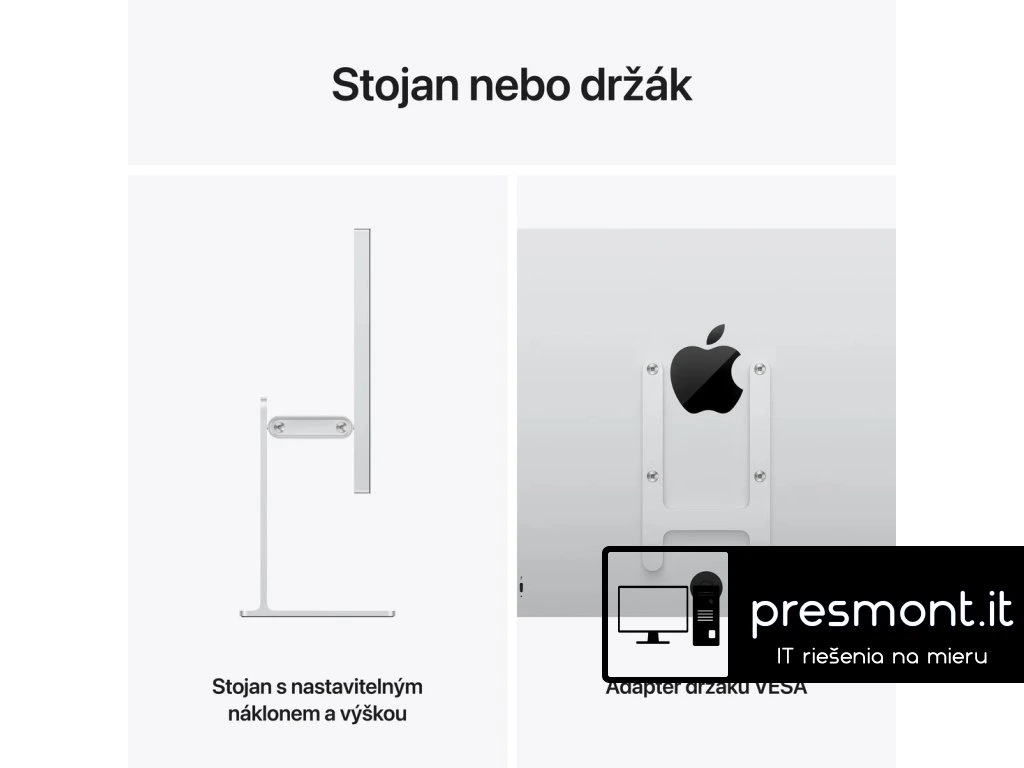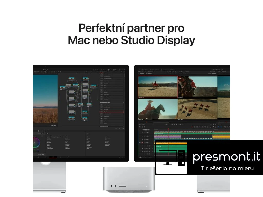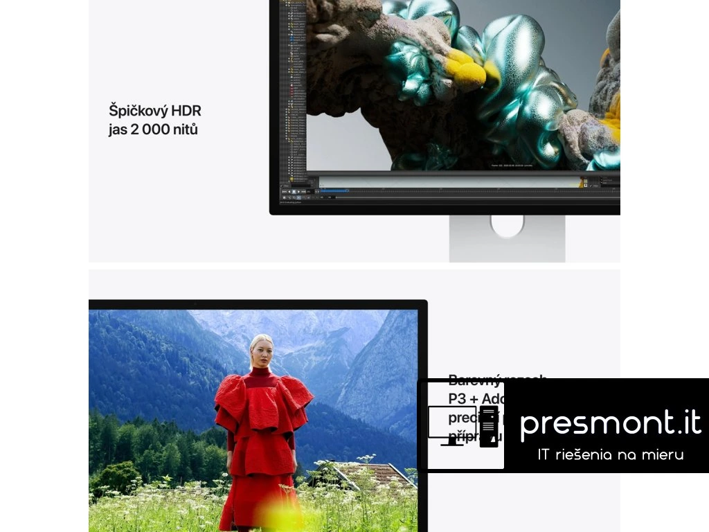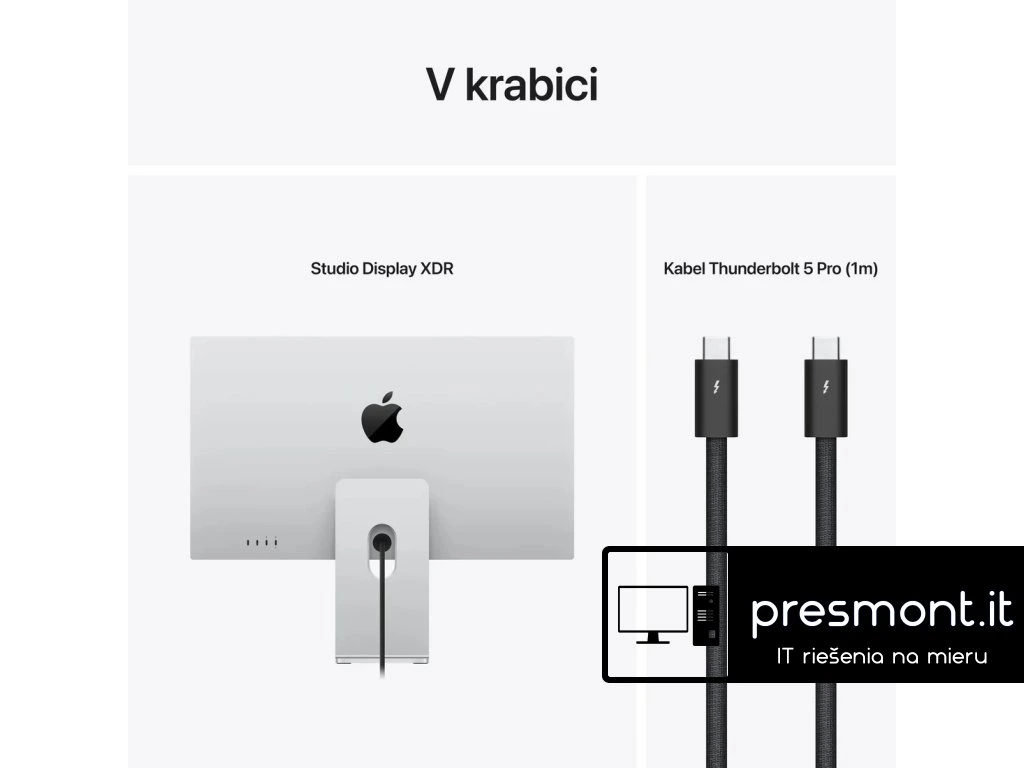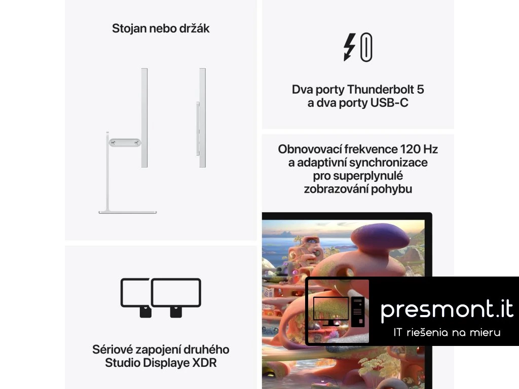 Vyspělý 27palcový Retina 5K XDR displej. Špičkový HDR jas 2 000 nitů, P3 + Adobe RGB a 120Hz. Ultimátní profesionální displej *27'' Retina 5K XDR displej *Jas až 1 000 nitů (SDR) *Špičkový jas (HDR) 2 000nitů *Adaptivní synchronizace *Široký barevný gamut P3 + Adobe RGB *Technologie True Tone Typ obrazovky: ,Retina 5K XDR displej Podsvícení: ,Mini-LED podsvícení s 2 304 zónami stmívání Úhlopříčka [palce]: ,27'' Rozlišení: ,5120 x 2880 při pixelech na palec Obnovovací frekvence [Hz]: ,120Hz Poměr stran: ,16:9 Povrch displeje: ,Matný Kontrast: ,1 000 000:1 Pozorovací úhly (Horizontál/Vertikál): ,178°/178° , Počet barev: ,1 miliarda barev Reproduktory: ,Ano Konektory: , *1x port Thunderbolt 5 (•) na připojení hostitele (s napájením hostitele výkonem 140 W) *1x downstream port Thunderbolt 5 na připojení vysokorychlostních doplňků nebo sériové připojení dalších displejů *2x USB-C (až 10Gb/s) porty na připojení periferních zařízení, úložišť a sítě Napájení: ,až 140W přes Thunderbolt 5 Třída energetické náročnosti: ,G Montáž na zeď: ,Ano *adaptér držáku VESA *Kompatibilní s VESA stojanem 100 x 100 mm *Orientace: na šířku nebo na výšku Referenční režimy: • ,  ,Studio Display XDR (P3 - 2 000 nitů) • ,  ,Studio Display XDR (P3 + Adobe RGB - 2 000 nitů) • ,  ,HDR video (P3-ST 2084) • ,  ,HDTV video (BT.709-BT.1886) • ,  ,NTSC video (BT.601 SMPTE-C) • ,  ,PAL a SECAM video (BT.601 EBU) • ,  ,Digitální kino (P3-DCI) • ,  ,Digitální kino (P3-D50) • ,  ,Návrh a tisk (P3-D50) • ,  ,Návrh a tisk (Adobe RGB-D50) • ,  ,Fotografie (P3-D65) • ,  ,Fotografie (Adobe RGB-D65) • ,  ,HDR fotografie (P3-D65) • ,  ,Internet a web (sRGB) Barva: ,stříbrná Rozměry (ŠxVxH mm): ,623x362x33mm Hmotnost [kg]: ,6,3kg Obsah balení: , *Studio Display XDR *Kabel Thunderbolt 5 Pro (1m) *Adaptér držáku VESADodatočné parametre