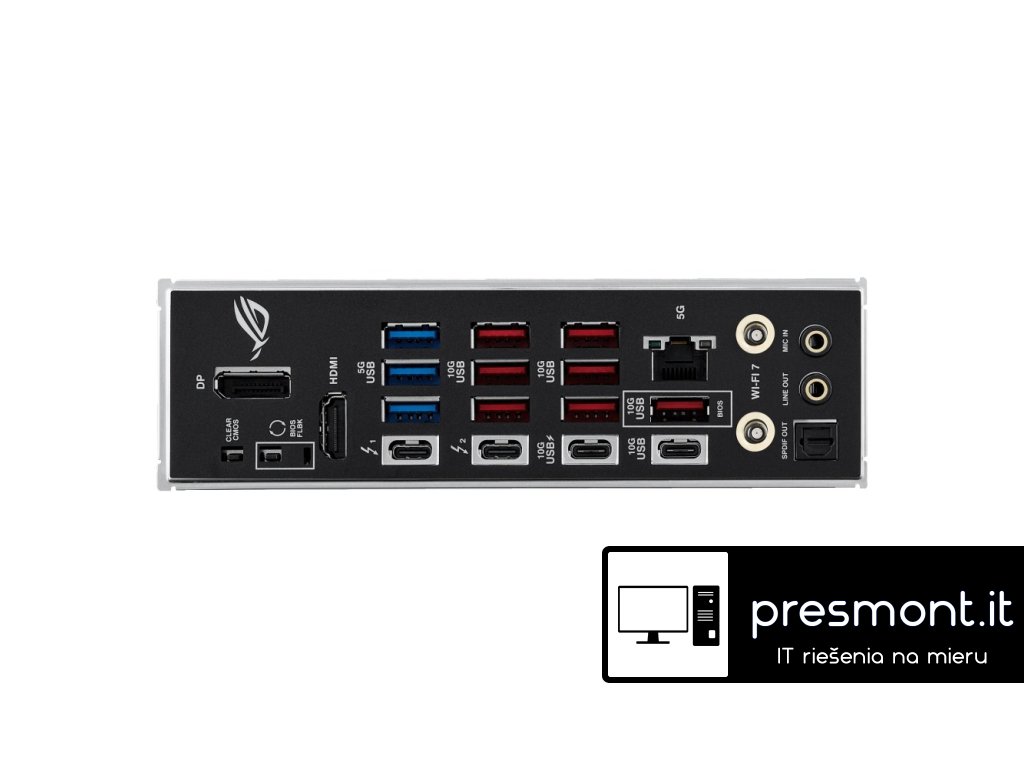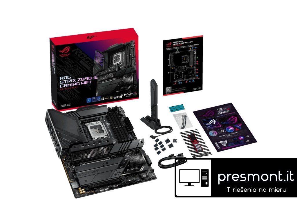 ASUS ROG STRIX Z890-E GAMING WIFI * Aura Sync * EZ PC DIY * BIOS Q-Dashboard * AI Networking II * AI Cooling II * AI Overclocking * AI Advisor Chipset: Intel® Z890 Rozměrový formát: ATX (305x244mm) Podpora pro procesory: Intel® Core™ Ultra (řada 2) Patice procesoru: LGA1851 Paměť: * 4x DIMM, max. 192GB, DDR5 8800+MT/s (OC), bez ECC, bez vyrovnávací paměti DIMM (CUDIMM) * dvoukanálová architektura paměti * podporuje Intel® Extreme Memory Profile (XMP) * DIMM Flex * NitroPath DRAM * DIMM FIT * ASUS Enhanced Memory Profile III (AEMP III) Grafické výstupy: specifikace grafiky se mohou u různých typů procesorů lišit * 1x DisplayPort 1.4 * 1x HDMI 2.1 * 2x Intel® Thunderbolt™ 4 (USB typ C®) podporuje video výstupy DisplayPort a Thunderbolt™ Zvuková karta: ROG SupremeFX 7.1 Surround Sound High Definition Audio CODEC ALC4080 - podporuje přehrávání až 32bit/384 kHz na předním panelu, Savitech SV3H712 AMP Ethernet: 1x Realtek 5GbE WLAN + Bluetooth: Wi-Fi 7 2x2 (802.11be) + Bluetooth® v5.4 Rozšiřující sloty: * 1x PCIe 5.0 x16 * 1x PCIe 4.0 x16 (podpora režimu x4) RAID řadič: Intel® Rapid Storage podporuje PCIe RAID 0/1/5/10, SATA RAID 0/1/5/10, slot M.2 z CPU podporuje pouze RAID 0/1/5 Úložný prostor: celkem podporuje 7 slotů M.2 a 4 porty SATA 6Gb/s * M.2_1 (Key M), typ 2242/2260/2280/22110 (podpora PCIe 5.0 x4) * M.2_2 (Key M), typ 2280 (podpora PCIe 4.0 x4) * M.2_3 (Key M), typ 2242/2260/2280 (podpora PCIe 5.0 x4) * M.2_4 (Key M), typ 2242/2260/2280 (podpora PCIe 5.0 x4) * M.2_5 (Key M), typ 2280 (podpora PCIe 4.0 x4) * M.2_6 (Key M), typ 2280 (podpora PCIe 4.0 x4) * M.2_7 (Key M), typ 2242/2260/2280 (podpora PCIe 4.0 x4 a SATA) * 4x SATA 6Gb/s USB: Zadní USB (celkem 14 portů) * 2x Thunderbolt™ 4 (2x USB typ C®) * 9x USB 10Gb/s (7x typ A + 1x USB typ C® + 1x USB typ C® s až 30W PD rychlonabíjení) * 3x USB 5Gb/s (3x typ A) Přední USB (celkem 11 portů) * 1x USB 20Gb/s (podpora USB typ C®) * 2x USB 5Gb/s header podpora 4 dalších portů USB 5Gb/s * 3x USB 2.0 header podpora 6 dalších portů USB 2.0 Porty na zadním panelu: * 2x Thunderbolt™ 4 (2x USB typ C®) * 9x USB 10Gb/s (7x typ A + 1x USB typ C® + 1x USB typ C® s až 30W PD rychlonabíjení) * 3x USB 5Gb/s (3x typ A) * 1x DisplayPort * 1x HDMI® * 1x modul Wi-Fi * 1x RJ-45 Realtek 5Gb * 2x pozlacený audio konektor * 1x optický výstup S/PDIF * 1x tlačítko BIOS FlashBack™ * 1x tlačítko Clear CMOS Interní porty: Související s ventilátorem a chlazením * 1x 4pin CPU Fan header * 1x 4pin CPU OPT Fan header * 1x 4pin AIO Pump header * 5x 4pin Chassis Fan header Napájení * 1x 24pin hlavní napájecí konektor * 2x 8pin +12V CPU napájecí konektor Související s úložištěm * 7x slot M.2 (key M) * 4x port SATA 6Gb/s USB * 1x USB 20Gb/s (podpora USB typ C®) * 2x USB 5Gb/s header podpora 4 dalších portů USB 5Gb/s * 3x USB 2.0 header podpora 6 dalších portů USB 2.0 Ostatní * 3x Addressable Gen 2 header * 1x Chassis Intrusion header * 1x CPU Over voltage jumper * 1x tlačítko FlexKey * 1x Front Panel Audio header (F_AUDIO) * 1x tlačítko Start * 1x 10-1pin System Panel header * 1x Thermal Sensor header * 1x Thunderbolt™ (USB4®) header BIOS: 256Mb Flash ROM, UEFI AMI BIOS Příslušenství Kabely: * 2x SATA 6Gb/s kabel Přídavná chladicí sada: * 1x tepelná podložka pro M.2 22110 Různé: * 1x ASUS WiFi Q-anténa * 1x balení stahovacích pásek * 1x balení M.2 Q-Latch * 2x M.2 Q-Slides * 1x ROG klíčenka * 1x samolepky ROG Strix * 7x M.2 podložka * 1x průvodce instalací Odkaz na stránky výrobce: https://rog.asus.com/motherboards/rog-strix/rog-strix-z890-e-gaming-wifi/Dodatočné parametre