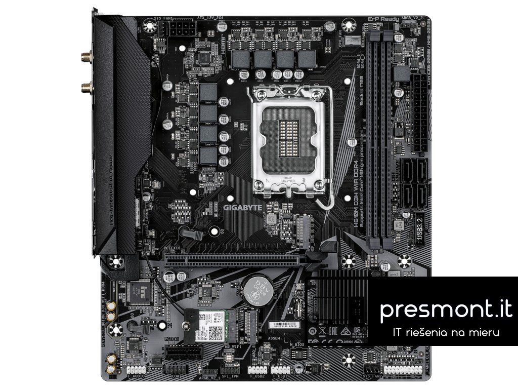 GIGABYTE H610M D3H WIFI DDR4 * Smart Fan 6 Chipset: Intel® H610 Express Rozměrový formát: Micro ATX (244x220mm) Podpora pro procesory: 14., 13. a 12. generace Intel® Core™, Pentium® Gold a Celeron® Patice procesoru: LGA1700 Paměť: * 2x DIMM patice podporující až 64GB, DDR4 3200/3000/2933/2666/2400/2133MT/s * dvoukanálová architektura paměti * podpora paměťových modulů Extreme Memory Profile (XMP) Grafické výstupy: podpora Intel® HD Graphics (specifikace grafiky se mohou u různých typů procesorů lišit) * 1x HDMI® 2.1 Zvuková karta: kodek Realtek 7.1 Surround Sound High Definition Audio Ethernet: Realtek® GbE LAN WLAN + Bluetooth: Intel® Wireless- AC 9560, Wi-Fi 802.11ac + BT v5.1 Rozšiřující sloty: * 1x PCI Express x16 s podporou PCIe 4.0 a běžícím na x16 * 1x PCI Express x1 s podporou PCIe 3.0 a běžícím na x1 Úložný prostor: celkem podporuje 2 sloty M.2 a 4 porty SATA 6Gb/s * 1x M.2, M key, typ 2280/2260 - podpora PCIe 3.0 x4/x2 SSD (M2P_SB) * 1x M.2 M key, typ 2280/2260 PCIe 3.0 x2 SSD (M2Q_SB) * 4x port SATA 6Gb/s USB: Zadní USB (celkem 6 portů) * 2x USB 3.2 Gen 1 * 4x USB 2.0/1.1 Přední USB (celkem 6 portů) * 1x USB 3.2 Gen 1 header - podpora dalších 2 portů USB 3.2 Gen 1 * 2x USB 2.0/1.1 header - podpora dalších 4 portů USB 2.0/1.1 Porty na zadním panelu: * 2x USB 3.2 Gen 1 * 4x USB 2.0/1.1 * 1x PS/2 pro klávesnici * 1x PS/2 pro myš * 2x SMA anténní konektor (2T2R) * 1x HDMI 2.0 * 1x RJ-45 * 3x audio konektor Interní porty: Napájení * 1x 24-pin ATX hlavní napájecí konektor * 1x 8-pin ATX 12V napájecí konektor Související s ventilátorem a chlazením * 1x CPU fan header * 2x system fan header Související s úložištěm * 2x M.2 slot (Key M) * 4x SATA 6Gb/s port USB * 1x USB 3.2 Gen 1 header * 2x USB 2.0/1.1 header Ostatní * 2x adresovatelný RGB Gen2 LED strip header * 1x front panel header * 1x front panel audio header * 1x Trusted Platform Module header (pouze pro modul GC-TPM2.0 SPI/GC-TPM2.0 SPI 2.0/GC-TPM2.0 SPI V2) * 1x serial port header * 1x Clear CMOS jumper BIOS: 1x 128Mb flash, AMI UEFI BIOS (PnP 1.0a, DMI 2.7, WfM 2.0, SM BIOS 2.7, ACPI 5.0) Odkaz na stránku výrobce: https://www.gigabyte.com/Motherboard/H610M-D3H-WIFI-DDR4#kfDodatočné parametre