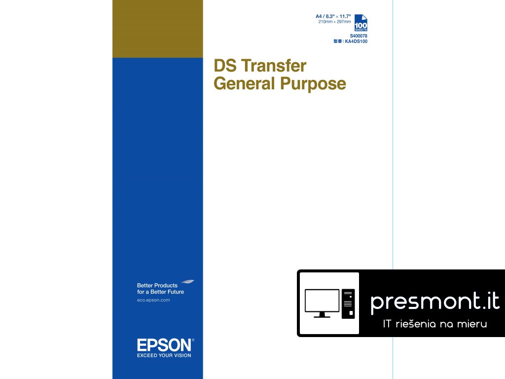 Papír pro sublimační tisk Hmotnost papíru: 87 g/m2 Všestrannost Víceúčelový DS transferový papír byl vyvinut pro sublimaci dekorativního potisku na pevné materiály a polyesterové textilie. Je kompatibilní s inkousty Epson UltraChrome DS a určený k použití se sublimačními tiskárnami SureColor SC-F500, SC-F500 a SC-F100. Vyšší produktivita Rychleschnoucí povrchová úprava papíru šetří cenný čas. Úspora inkoustu Víceúčelový transferový papír DS se vyznačuje vysokou úrovní přenosu inkoustu, což podporuje konzistenci výroby a přispívá k úsporám.Dodatočné parametre