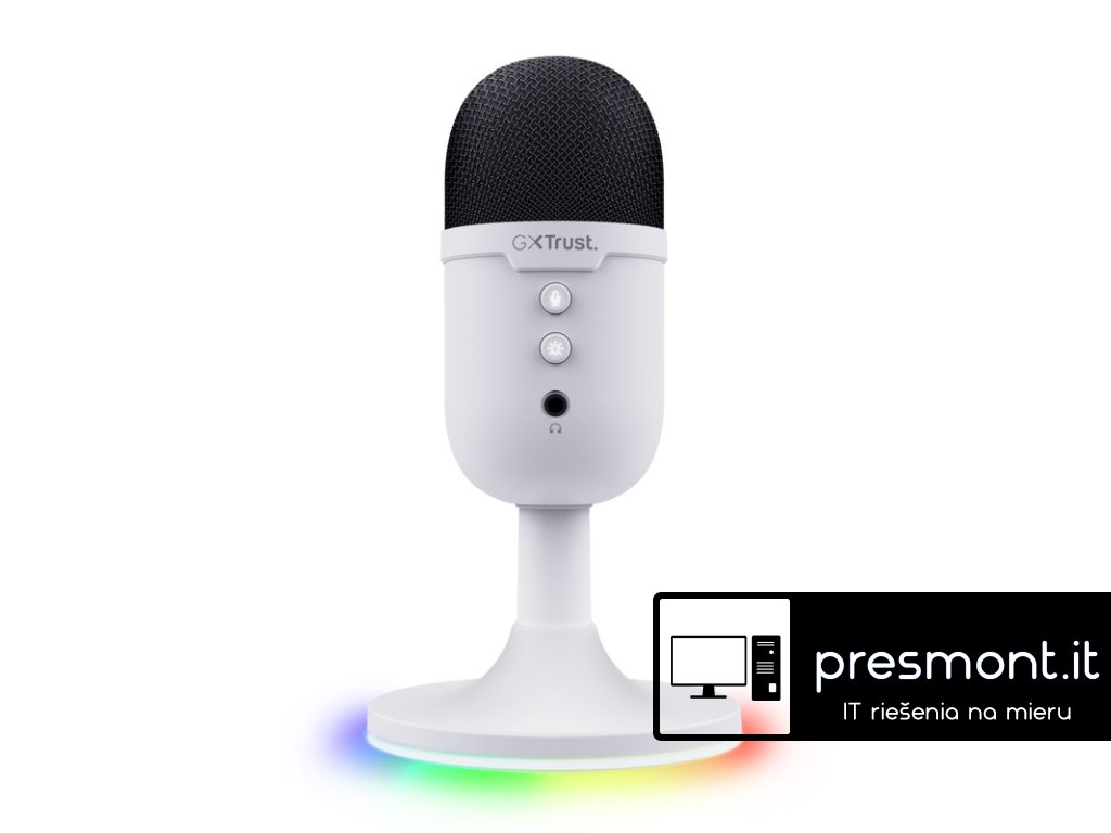 Trust Gaming GXT 234W Yunix kompaktní USB herní mikrofon ideální pro streamování a tvorbu obsahu * multiplatformní funkce umožňují používat mikrofon s počítačem, konzolí PlayStation nebo počítačem Mac * praktický stojan s RGB LED osvětlením a nastavitelným úhlem v sobě spojuje styl i kvalitu * zásluhou kardioidního záznamového vzoru bude váš hlas slyšet jasně a zřetelně * snadný přístup k funkci ztlumení mikrofonu pomocí praktického tlačítka na přední straně * vestavěný pop filtr mikrofonu zajišťuje filtrování jen toho, co chcete, aby bylo slyšet * výstup pro sluchátka vám umožní poslouchat, co nahráváte Technické parametry Hladina akustického tlaku: 100 dB Maximální vzorkovací frekvence: 48 kHz/16 bitů Podsvícení: ano Poměr signálu k šumu: 62 dB Frekvenční rozsah: 100Hz-16kHz Impedance: 2200 Ohmů Citlivost: 32 dB Ztlumení mikrofonu: ano Typ připojení: 3,5mm, USB-A Délka kabelu: 1,8m Barva: bílá Rozměry: 108x55x55mm Hmotnost: 216g Požadavky na systém: volný port USB, Windows, macOS, Chrome OS Obsah balení: * herní mikrofon * návod k použití Záruka: 2 roky Odkaz na stránku výrobce: https://www.trust.com/en/product/25374-gxt-234w-yunix-usb-gaming-microphone-whiteDodatočné parametre