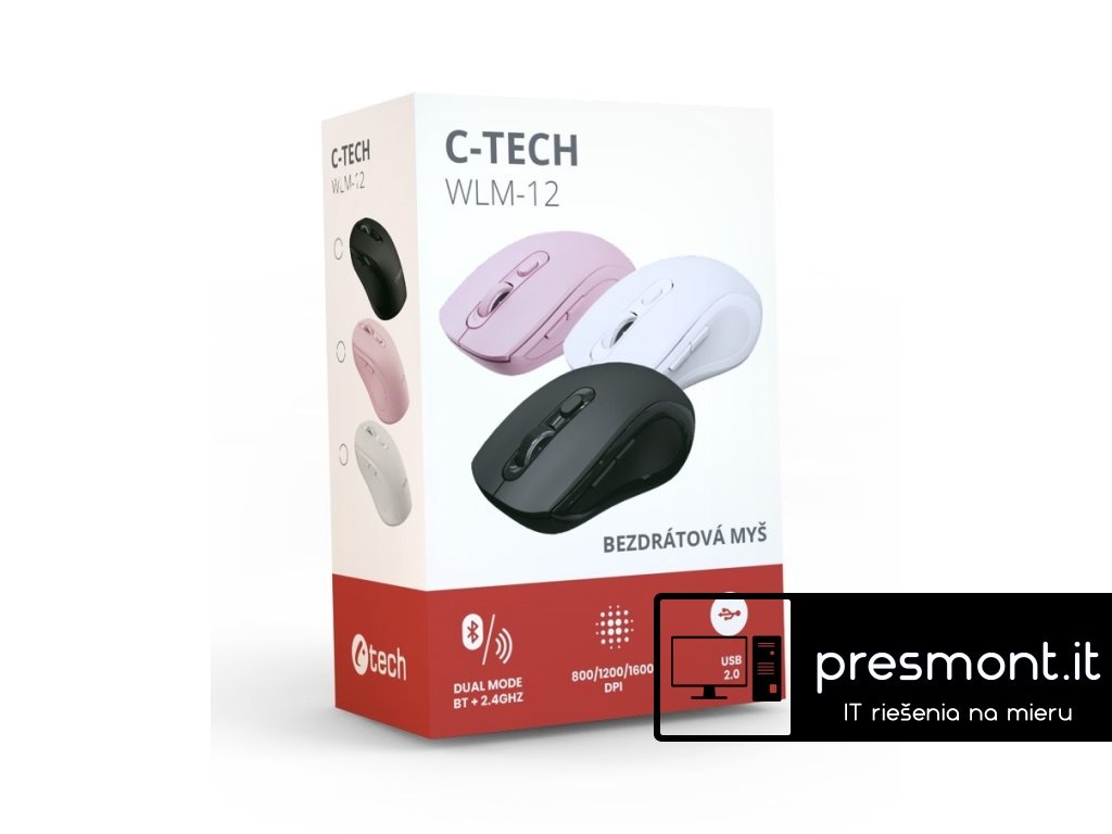 Nová bezdrátová myš C-tech WLM-12 přináší pokročilou technologii a pohodlný design pro maximální uživatelský komfort. Hlavním lákadlem této myši je její podpora Dual mode režimu, který umožňuje uživatelům volit mezi dvěma různými způsoby připojení podle svých preferencí. První možností je bezdrátové připojení pomocí Bluetooth technologie. Tato volba je ideální pro ty, kteří chtějí eliminovat nepořádek spojený s kabely a hledají flexibilitu připojení k různým zařízením. Díky Bluetooth spojení můžete myš snadno propojit s vaším počítačem, notebookem nebo dokonce chytrým zařízením bez nutnosti přidávání jakýchkoli adaptérů. Druhou možností je klasické připojení pomocí 2.4GHz technologie pomocí dodávaného USB dongle. S rozlišením 1600dpi zajišťuje C-tech WLM-12 přesnost a citlivost pro hladké a přesné pohyby na obrazovce. Díky tomu můžete efektivně pracovat, surfovat po internetu nebo si užívat zábavu bez zbytečného zpomalení či trhání kurzoru. C-tech WLM-12 se může pochlubit elegantním, ergonomicky tvarovaným designem, který umožní pohodlné ovládání po dlouhou dobu. Myš je k dispozici ve třech elegantních barvách: klasické černé, čistě bílé a nápadně růžové. Tím si každý uživatel může vybrat barvu, která nejlépe vyhovuje jeho osobnímu stylu a pracovnímu prostředí. Specifikace : Rozhraní: Bluetooth, Wireless 2.4GHz band, dosah signálu až 10m Nano receiver: USB 2.0 Rozlišení: 800-1200-1600 DPI 6 tlačítek Napájení: 1x AA baterie (součástí balení) Rozměry : 106x66x35mm Váha : 86gDodatočné parametre