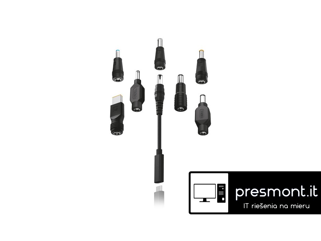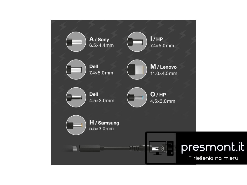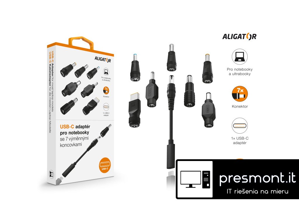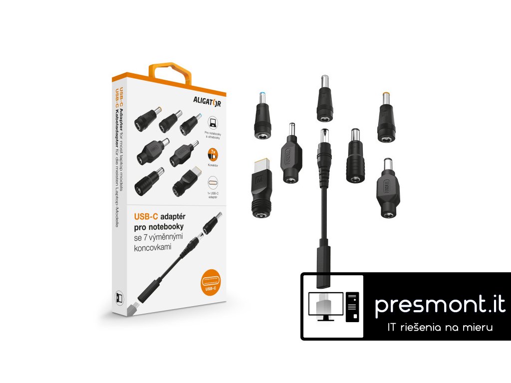 USB-C adaptér pro notebooky a ultrabooky se 7 výměnnými koncovkami Miniaturní USB-C adaptér se 7 výměnnými konektory řady ALIGATOR POWER. Tento adaptér je ideálním pomocníkem pro dobíjení velké části notebooků a ultrabooků. Pečlivě jsme si dali záležet při výběru typů konektorů. Vyberte si jeden ze 7 přiložených konektorů (koncovek), který bude vhodný pro nabíjení Vašeho zařízení. Miniaturní rozměry adaptéru jsou tak pohodlným doplňkem doma i na cestách. Adaptér disponuje USB-C vstupem pro připojení USB-C nabíječky. Nabíječku vždy vybírejte podle výkonnostních požadavků nabíjeného zařízení. 7 výměnných konektorů *A/Sony (6,5 x 4,4 mm) *Dell (7,4 x 5,0 mm) *Dell (4,5 x 3,0 mm) *H/Samsung (5,5 x 3,0 mm) *I/HP (7,4 x 5,0 mm) *M/Lenovo (7,4 x 5,0 mm) *O/HP (4,5 x 3,0 mm) Technické parametry: *Určení: Notebooky Ultrabooky *Vstup: USB-C *Výstup: viz. konektor *Délka adaptérové propojky: 16,5 cm *Barva: černáDodatočné parametre