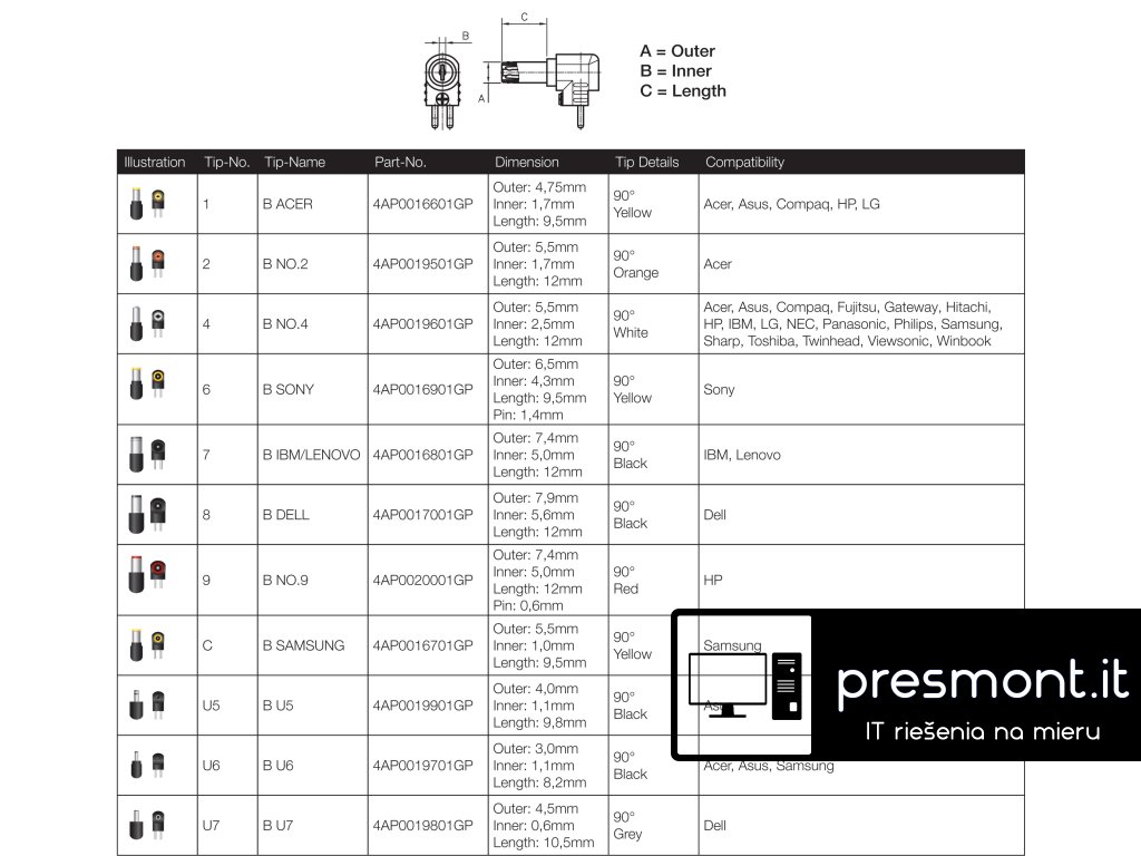 FSP se zajímá a produkuje ekologicky šetrné výrobky. V tomto případě tak nabízí jednotlivé koncovky pro své ekologicky šetrné napájecí adaptéry FSP/Fortron. Je to ta nejlepší volba, pokud potřebujete pouze jednu nebo několik konkrétních koncovek. * vyměnitelná koncovka pro adaptéry FSP/Fortron * koncovka pro notebook (Acer) * retailové balení v sáčku * číslo koncovky: 2 * barva: oranžová * rozměr vnější: 5,5 * rozměr vnitřní: 1,7 * délka: 12Dodatočné parametre