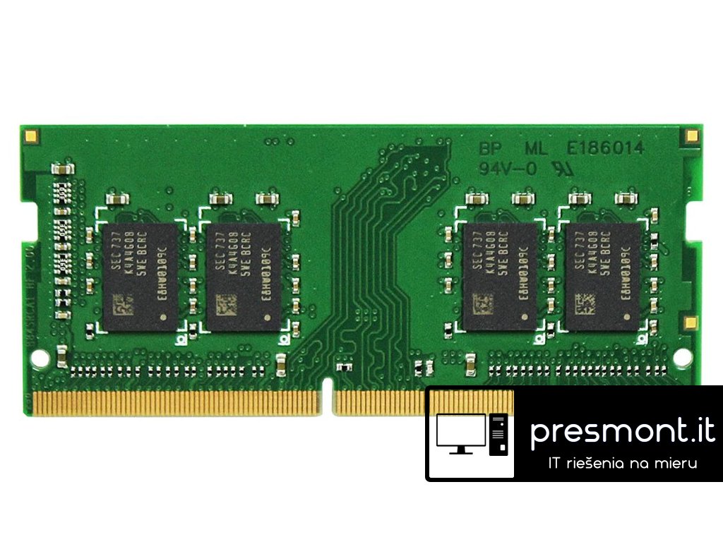 D4NESO-2666-4G- Rozšiřující paměť Synology pro NVR DVA3219 Společnost Synology je známým výrobcem celé řady síťových prvků od NAS přes NVR až po routery a jejich příslušenství. Ta vám nyní přináší rozšiřující paměť pro svůj NVR DVA3219. Paměť typu DDR4 SO-DIMM poskytuje kapacitu 4 GB. Operuje na frekvenci 2666 MHz při napětí 1,2 V. Je v unbuffered, non-ECC provedení. TECHNICKÉ VLASTNOSTI Využití paměti: NAS server Typ paměti: DDR4 SO-DIMM Konfigurace paměti: 1 x 4GB Pracovní frekvence [MHz]: 2 666 Form factor: 288-pin DIMM Pracovní napětí [V]: 1,2Dodatočné parametre