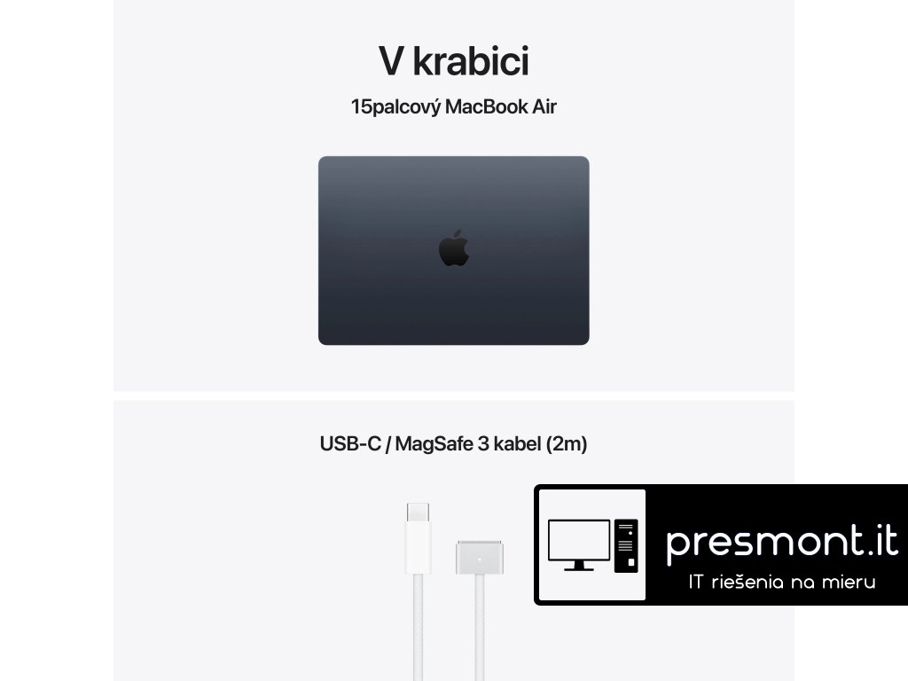 Apple MacBook Air 15'' s čipem M5 *Apple Intelligence Operační systém: macOS Procesor: Apple M5, 10jádrové CPU (4P+6E), 10jádrové GPU, 16jádrový Neural Engine, propustnost paměti 153 GB/s Paměť: 16GB Pevný disk: 512GB SSD Optická mechanika: ne Čtečka paměťových karet: ne Displej: 15,3'' Liquid Retina IPS, 2880×1864 při 224 pixelech na palec, LED podsvícení, 500 nitů, True Tone Audio: 6x reproduktor s wooferem, Dolby Atmos, 3x mikrofon Webkamera: 12Mpx Center Stage, 1080p HD video Polohovací zařízení: Force Touch trackpad Podsvícená klávesnice: ano Layout klávesnice: SK Numerická klávesnice: ne Čtečka otisků prstů: Touch ID Síť: ne Bezdrátová komunikace: Wi-Fi 7 (802.11be) + Bluetooth 6 Porty USB: *2x Thunderbolt/USB 4 (nabíjení, DisplayPort, Thunderbolt 4: až 40Gb/s, USB4: až 40Gb/s) Ostatní porty: *1x MagSafe 3 *1x 3,5mm sluchátkový konektor Baterie: vestavěná 66,5Wh lithium-polymerová Výdrž baterie: až 15 hodin bezdrátového prohlížení webu Napájení: napájecí adaptér se prodává zvlášť (minimální příkon potřebný k nabíjení zařízení je 140 W) Barva: temně inkoustová Rozměry: 340,4x237,6x11,5mm Hmotnost: 1,51kg V krabici: *15'' MacBook Air *USB-C/MagSafe 3 kabel (2m) *SK návod součástí balení Záruka: 1 rokDodatočné parametre
