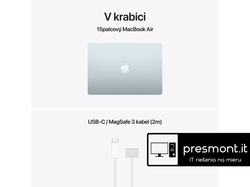 Apple MacBook Air 15'' s čipem M5 *Apple Intelligence Operační systém: macOS Procesor: Apple M5, 10jádrové CPU (4P+6E), 10jádrové GPU, 16jádrový Neural Engine, propustnost paměti 153 GB/s Paměť: 16GB Pevný disk: 512GB SSD Optická mechanika: ne Čtečka paměťových karet: ne Displej: 15,3'' Liquid Retina IPS, 2880×1864 při 224 pixelech na palec, LED podsvícení, 500 nitů, True Tone Audio: 6x reproduktor s wooferem, Dolby Atmos, 3x mikrofon Webkamera: 12Mpx Center Stage, 1080p HD video Polohovací zařízení: Force Touch trackpad Podsvícená klávesnice: ano Layout klávesnice: SK Numerická klávesnice: ne Čtečka otisků prstů: Touch ID Síť: ne Bezdrátová komunikace: Wi-Fi 7 (802.11be) + Bluetooth 6 Porty USB: *2x Thunderbolt/USB 4 (nabíjení, DisplayPort, Thunderbolt 4: až 40Gb/s, USB4: až 40Gb/s) Ostatní porty: *1x MagSafe 3 *1x 3,5mm sluchátkový konektor Baterie: vestavěná 66,5Wh lithium-polymerová Výdrž baterie: až 15 hodin bezdrátového prohlížení webu Napájení: napájecí adaptér se prodává zvlášť (minimální příkon potřebný k nabíjení zařízení je 140 W) Barva: ,blankytně modrá Rozměry: 340,4x237,6x11,5mm Hmotnost: 1,51kg V krabici: *15'' MacBook Air *USB-C/MagSafe 3 kabel (2m) *SK návod součástí balení Záruka: 1 rokDodatočné parametre