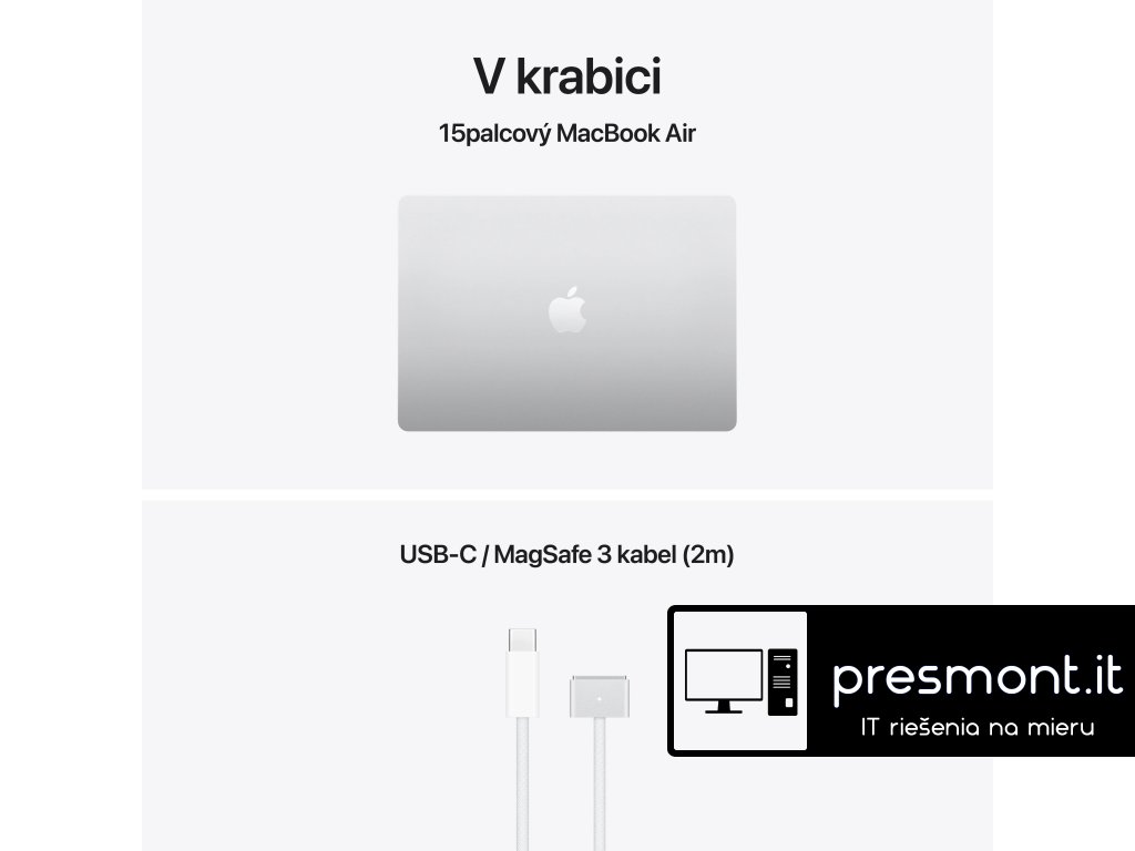 Apple MacBook Air 15'' s čipem M5 *Apple Intelligence Operační systém: macOS Procesor: Apple M5, 10jádrové CPU (4P+6E), 10jádrové GPU, 16jádrový Neural Engine, propustnost paměti 153 GB/s Paměť: 24GB Pevný disk: 1TB SSD Optická mechanika: ne Čtečka paměťových karet: ne Displej: 15,3'' Liquid Retina IPS, 2880×1864 při 224 pixelech na palec, LED podsvícení, 500 nitů, True Tone Audio: 6x reproduktor s wooferem, Dolby Atmos, 3x mikrofon Webkamera: 12Mpx Center Stage, 1080p HD video Polohovací zařízení: Force Touch trackpad Podsvícená klávesnice: ano Layout klávesnice: SK Numerická klávesnice: ne Čtečka otisků prstů: Touch ID Síť: ne Bezdrátová komunikace: Wi-Fi 7 (802.11be) + Bluetooth 6 Porty USB: *2x Thunderbolt/USB 4 (nabíjení, DisplayPort, Thunderbolt 4: až 40Gb/s, USB4: až 40Gb/s) Ostatní porty: *1x MagSafe 3 *1x 3,5mm sluchátkový konektor Baterie: vestavěná 66,5Wh lithium-polymerová Výdrž baterie: až 15 hodin bezdrátového prohlížení webu Napájení: napájecí adaptér se prodává zvlášť (minimální příkon potřebný k nabíjení zařízení je 140 W) Barva: stříbrná Rozměry: 340,4x237,6x11,5mm Hmotnost: 1,51kg V krabici: *15'' MacBook Air *USB-C/MagSafe 3 kabel (2m) *SK návod součástí balení Záruka: 1 rokDodatočné parametre