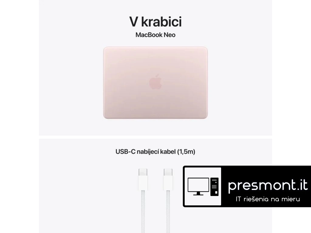 Apple MacBook Neo 13'' Operační systém: ,macOS Procesor: ,Čip A18 Pro (6jádrové CPU se 2 výkonnostními a 4 úspornými jádry) Paměť: ,8GB Pevný disk: ,256GB Displej: ,13'' Liquid Retina s LED podsvícením a technologií IPS, rozlišení 2408x1506 při 219 pixelech na palec Jas: ,500 nitů Grafická karta: ,A18 Pro (5jádrové GPU) Audio: ,Ano Web kamera: ,FaceTime HD kamera s rozlišením 1080p Polohovací zařízení: ,Multi-Touch trackpad Layout klávesnice: ,SK Síť: ,ne Bezdrátová komunikace: ,Wi-Fi 6E (802.11ax) A Bluetooth 6 Porty USB: , *1x USB 3 typ C port s podporou pro nabíjení, DisplayPort, USB 3 (až 10Gb/s) *1x USB 2 typ C port s podporou pro nabíjení a USB 2 (až 480Mb/s) Další porty: , *3,5mm sluchátkový konektor Baterie: ,36,5Wh lithium-iontová baterie Výdrž baterie: ,až 11 hodin bezdrátového prohlížení webu Napájení: ,napájecí adaptér se prodává zvlášť (minimální příkon potřebný k nabíjení zařízení: 20 W) Barva: ,Ruměná Materiál: ,Hliník Rozměry: ,297,5x12,7x206,4mm Hmotnost: ,1,23kg V krabici: *13'' MacBook Neo *nabíjecí kabel USB-C (1,5m) *slovenský návodDodatočné parametre