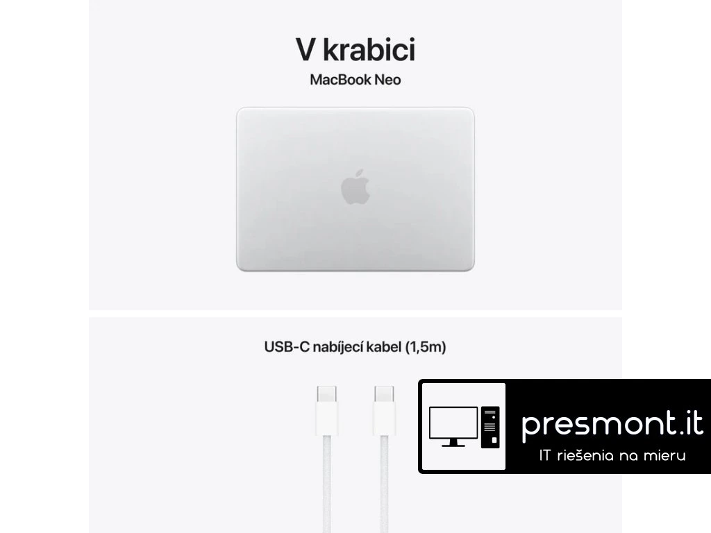 Apple MacBook Neo 13'' Operační systém: ,macOS Procesor: ,Čip A18 Pro (6jádrové CPU se 2 výkonnostními a 4 úspornými jádry) Paměť: ,8GB Pevný disk: ,512GB Displej: ,13'' Liquid Retina s LED podsvícením a technologií IPS, rozlišení 2408x1506 při 219 pixelech na palec Jas: ,500 nitů Grafická karta: ,A18 Pro (5jádrové GPU) Audio: ,Ano Web kamera: ,FaceTime HD kamera s rozlišením 1080p Polohovací zařízení: ,Multi-Touch trackpad + Touch ID Layout klávesnice: ,SK Síť: ,ne Bezdrátová komunikace: ,Wi-Fi 6E (802.11ax) A Bluetooth 6 Porty USB: , *1x USB 3 typ C port s podporou pro nabíjení, DisplayPort, USB 3 (až 10Gb/s) *1x USB 2 typ C port s podporou pro nabíjení a USB 2 (až 480Mb/s) Další porty: , *3,5mm sluchátkový konektor Baterie: ,36,5Wh lithium-iontová baterie Výdrž baterie: ,až 11 hodin bezdrátového prohlížení webu Napájení: ,napájecí adaptér se prodává zvlášť (minimální příkon potřebný k nabíjení zařízení: 20 W) Barva: ,Stříbrná Materiál: ,Hliník Rozměry: ,297,5x12,7x206,4mm Hmotnost: ,1,23kg V krabici: *13'' MacBook Neo *nabíjecí kabel USB-C (1,5m) *slovenský návodDodatočné parametre