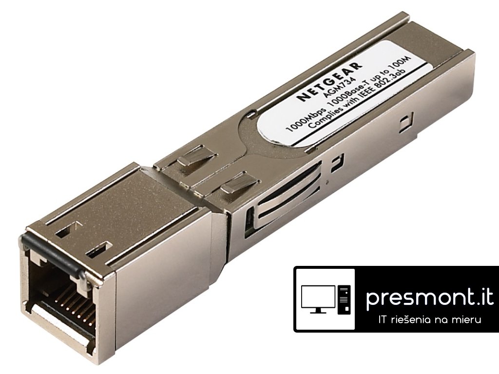 OVERVIEW Adds Gigabit Ethernet copper connectivity to XSM7224S and GSM7328FS Fits into standard SFP slots Drives Gigabit Ethernet up to 100m distances with CAT5E/CAT6 NETGEAR Warranty *This product is backed by a NETGEAR limited 5-year Hardware Warranty. *http://www.netgear.com/about/warranty/ TECH SPECS • 1000Base-T Gigabit Ethernet copper connectivity • RJ45 connector • Fits into the SFP+ interfaces of XSM7224S • Fits into the SFP interfaces of GSM7328FS • Drives Gigabit Ethernet up to 100m distances with CAT5E/CAT6 cables • 5-year warranty WEBSITE *Technical specification: http://www.netgear.com/business/products/switches/modules-accessories/agm734.aspx#tab-overviewDodatočné parametre