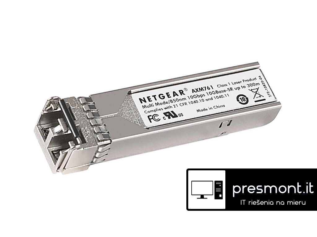 OVERVIEW SFP+ optic for multimode 50/125µm OM3 or OM4 fiber (Pack of 10 units AXM761P10-10000S) NETGEAR ProSafe 10 Gigabit SFP+ transceivers fit into M5300, M7100 and M7300 series standard SFP+ interfaces, providing hot-swappable installation and removal. Select Smart switches and Plus switches will also connect 10 Gigabit SFP+ transceivers. TECH SPECS *10 Gigabit Ethernet “short range” fiber connectivity *LC duplex connector *Fits into SFP+ interfaces of M5300, M7100 and M7300 series Managed Switches *Fits into SFP+ interfaces of select Smart and Plus Switches *Drives 10 Gigabit Ethernet up to 550 m (1,804 ft) distances with 50/125µm OM4 multimode fiber cables *Drives 10 Gigabit Ethernet up to 300 m (984 ft) distances with 50/125µm OM3 multimode fiber cables *Drives 10 Gigabit Ethernet up to 33 m (108 ft) distances with 62.5/125µm OM1/OM2 multimode fiber cables *Pack of 10 units AXM761P10-10000SDodatočné parametre
