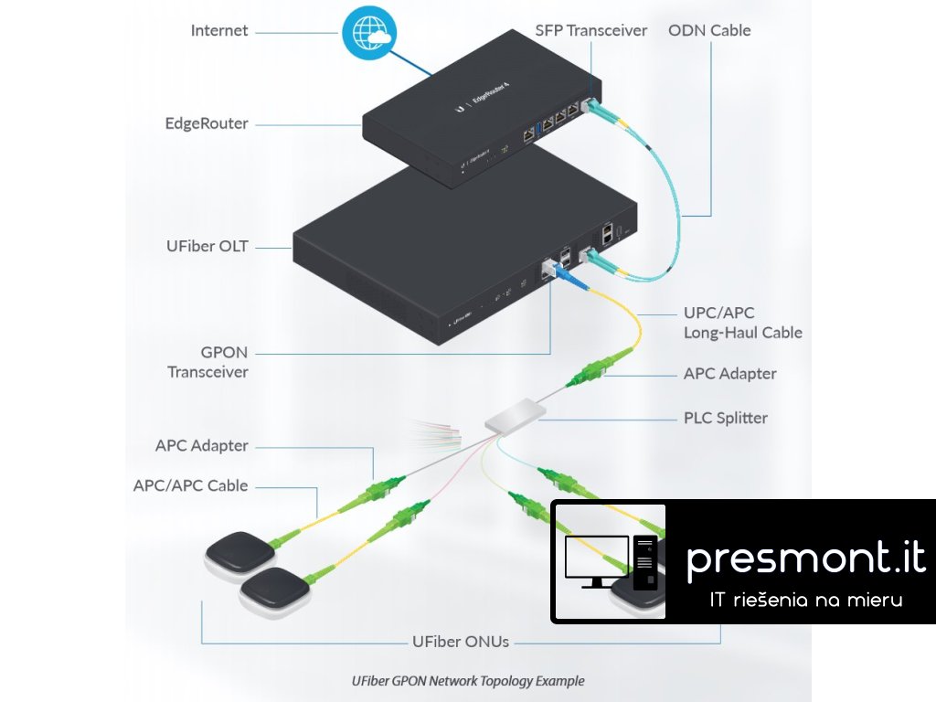 Popis produktu UFiber GPON SFP modul s označením UF-GP-B+ je určen do GPON slotů v OLT jednotce od Ubiquiti Networks. Jedná se o speciální SFP modul s asymetrickou rychlostí 2,5Gb/s upload, 1,25Gb/s download ve směru ke klientům. GPON SFP modul je zakončen SC konektorem s UPC broušením a má dosah až 20km. Vysílací výkon modulu je 1,5 až 5dBm, citlivost na příjmu je -8 až -28dBm. Technické parametry Konektory a rozhraní Optické konektory: (1) SC Optika Formát: SFP Pro Typ kabelu: Single Mode Přenosová rychlost: 1,244/2,488Gbps Vlnová délka - Tx/Rx [nm]: 1490/1310 Dosah [km]: 20 Typ přenosu: XPON Vysílací výkon [dBm]: 1,5 až 5 Přijímací citlivost [dBm]: -8 až -28 Software DDMI - diagnostika: AnoDodatočné parametre
