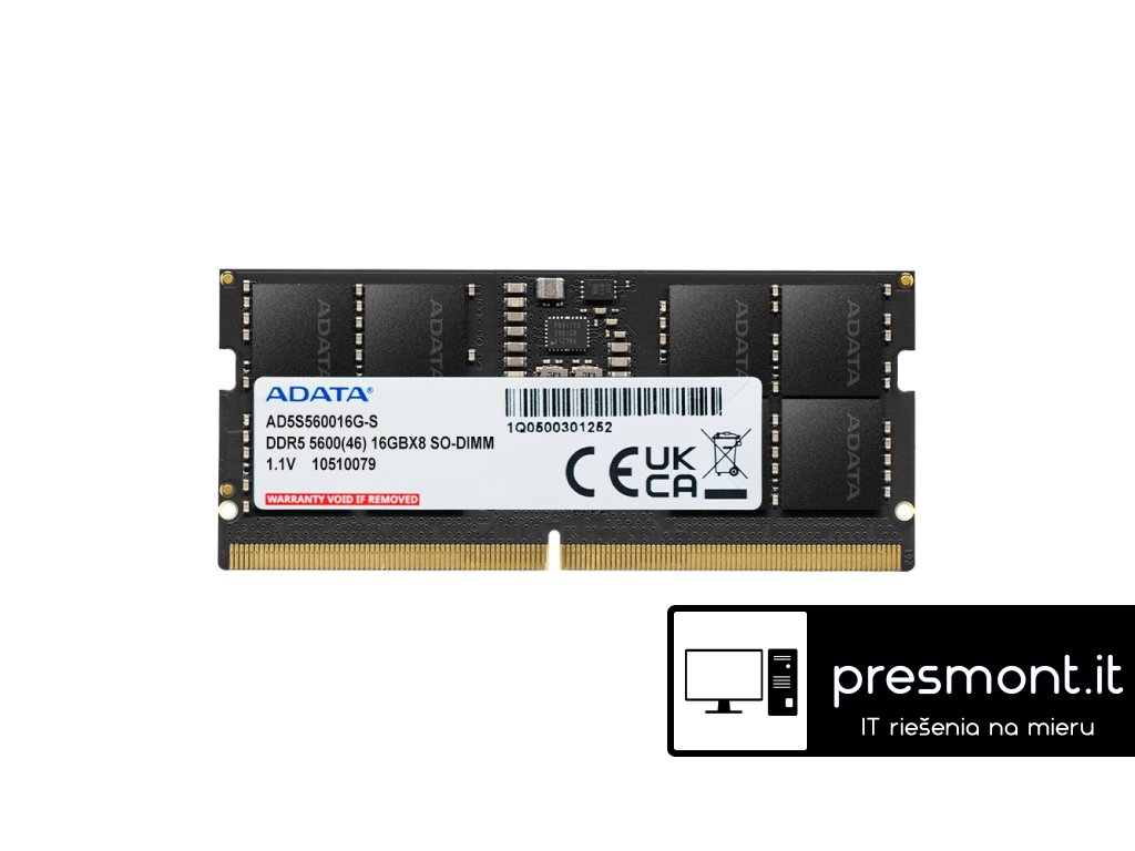Adata DDR5-5600 SO-DIMM 288-pin - paměťový modul Typ paměti: DDR5 Form Factor: SO-DIMM Kapacita paměti: 16GB Počet modulů v balení: 1x 16GB Rychlost: 5600MT/s Časování: CL46 Napětí: 1,1V Provozní teplota: 0°C až 85°CDodatočné parametre