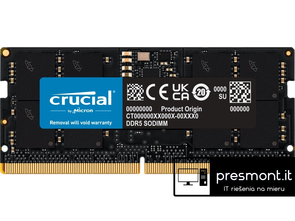 Crucial 16GB DDR5-5600 SODIMM Typ paměti: DDR5 Form Factor: SODIMM Kapacita paměti: 16GB Počet modulů v balení: 1x 16GB Rychlost: 5600MT/s Časování: CL46 Napětí: 1,1V Podsvícení: neDodatočné parametre